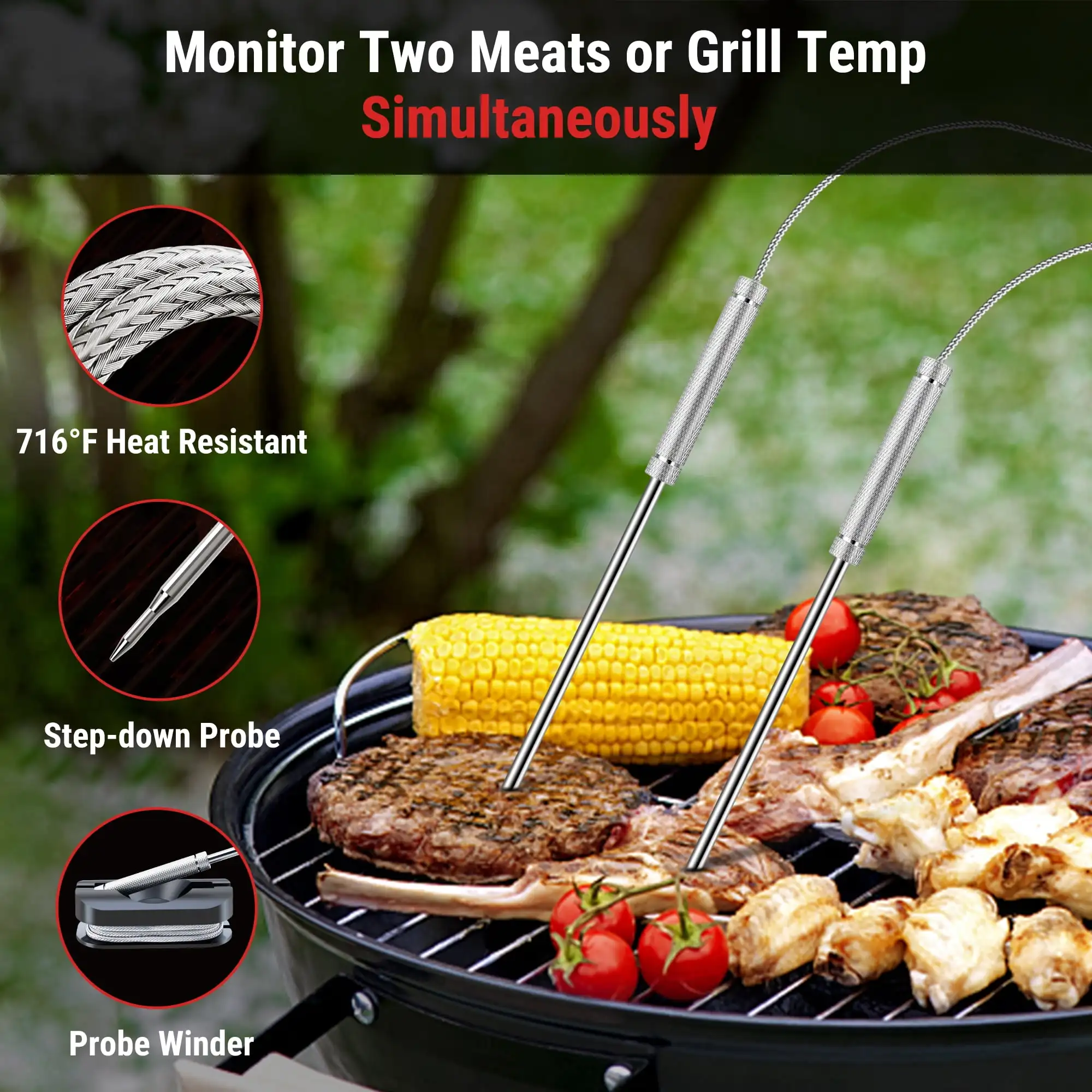 - Highly Accurate: Wireless thermometer features dual BBQ temperature stainless steel probes which can simultaneously monitor internal meat temperatures and ambient temperatures up to 572°F with an accuracy of ±1.8°F