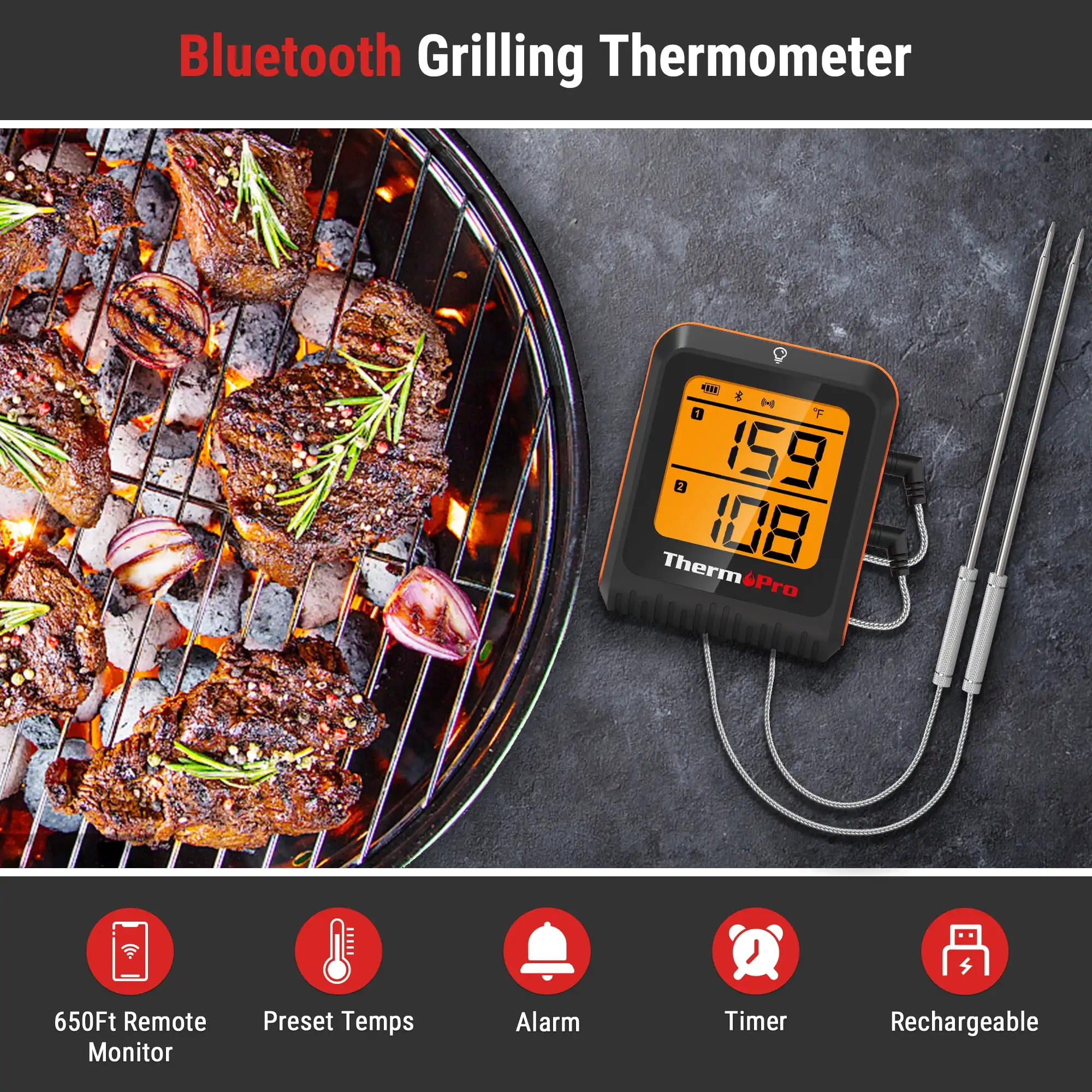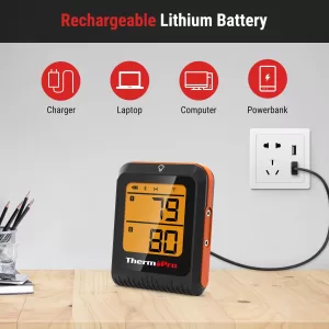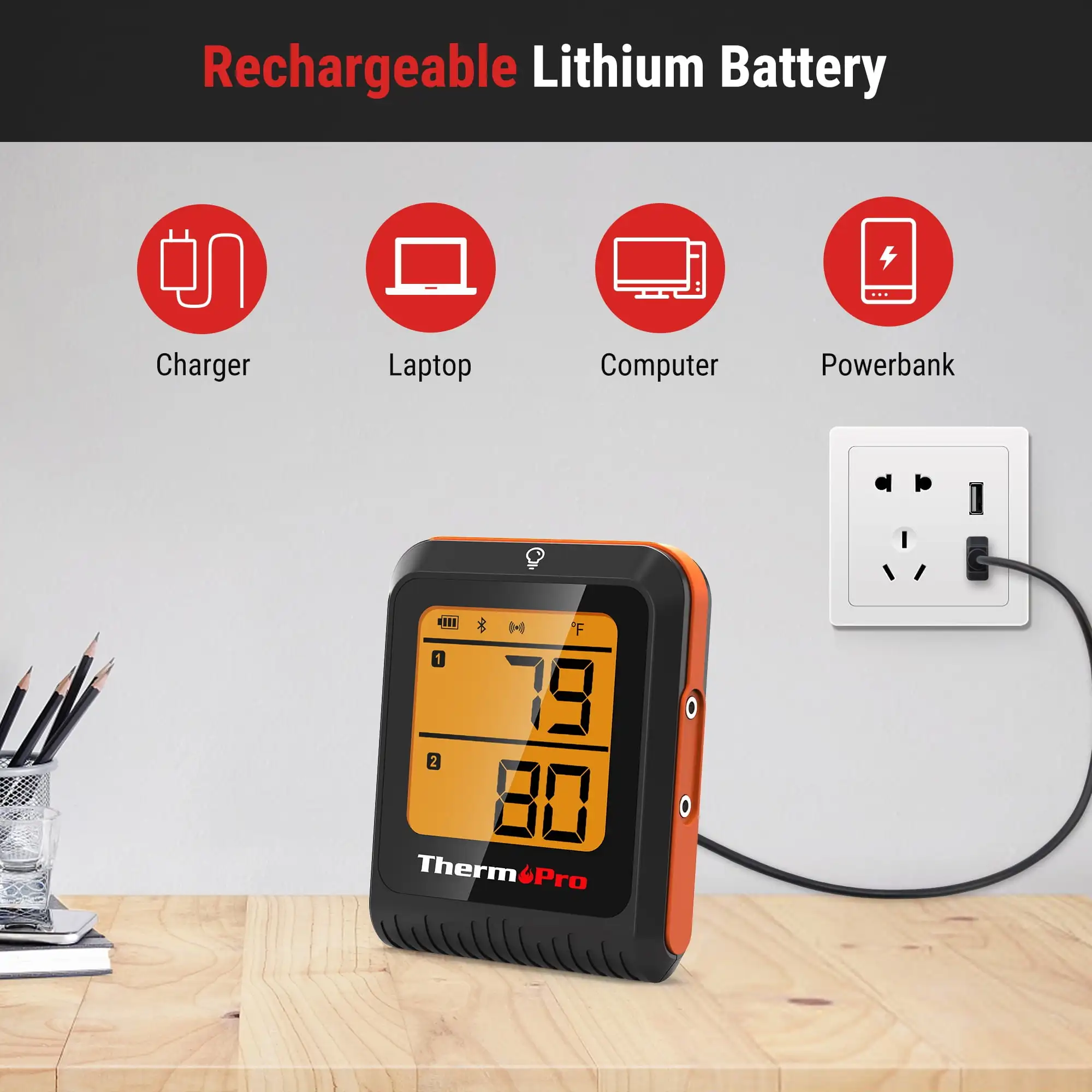 - Rechargeable Transmitter with Backlight LCD: This rechargeable Bluetooth thermometer can hold a charge for 8 months, providing worry-free operation that doesn’t require frequent battery changes. Large backlit LCD display shows temperatures for both stainless steel probes, allowing this meat thermometer for smokers to easily convey important info with just a quick glance