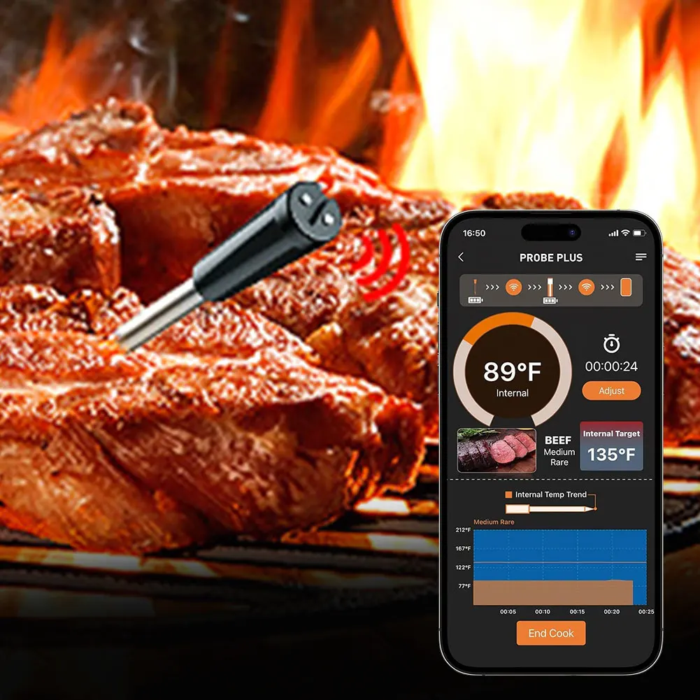 2.Guided Cooking System: With our smart app’s meat cooking time references, there are no more overcooked meals. Temperature updates every second to maintain juicy food for optimal taste, thanks to the BT meat thermometer, ensuring you achieve the best possible flavor.