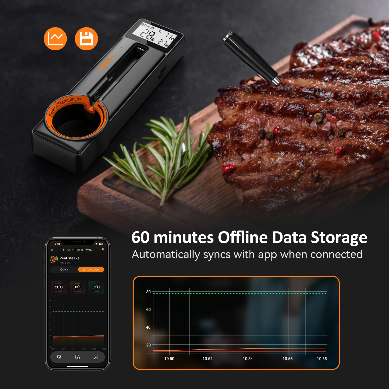 Monitor Cooking Anytime:Remotely monitor the cooking process on your smartphone from up to 328 ft/100 m via Bluetooth 5.4; Alternatively, view the real-time temperature changes on the clear LCD screen on the base. The base also saves 60 minutes of offline temperature data for complete data tracking