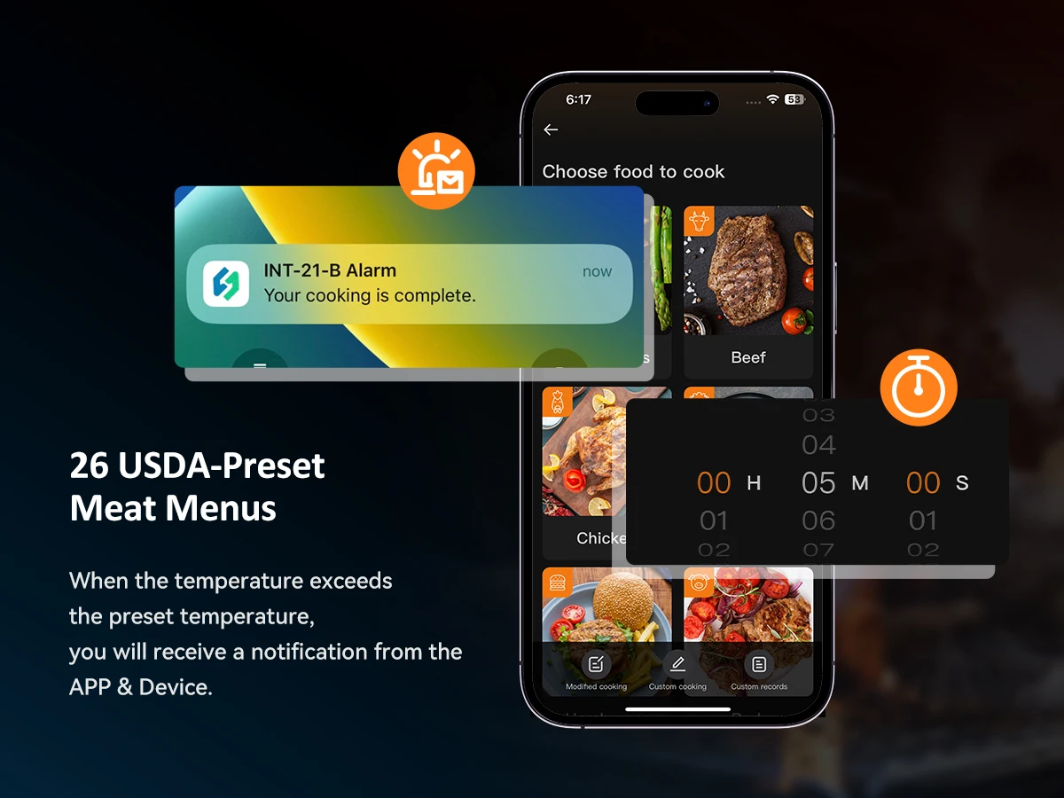 No Guesswork In Cooking: The smart app offers 26 preset meat menus that include USDA-recommended cooking temperatures, helping you effortlessly to roast great steaks that are both delicious and visually appealing. You can also set target temperature alarm and pre-alarm and count-up/down timer so you can enjoy the food at its best edible state