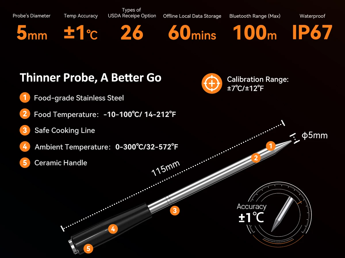 5 mm Ultra Thin Probe:Easy to insert and causing minimal damage to the meat texture; Features two inner sensors to simultaneously and quickly read food and oven temperatures in less than one second with high accuracy of up to 1 ℃/1.8 ℉, helping you to precisely control temperatures and achieve optimal cooking results