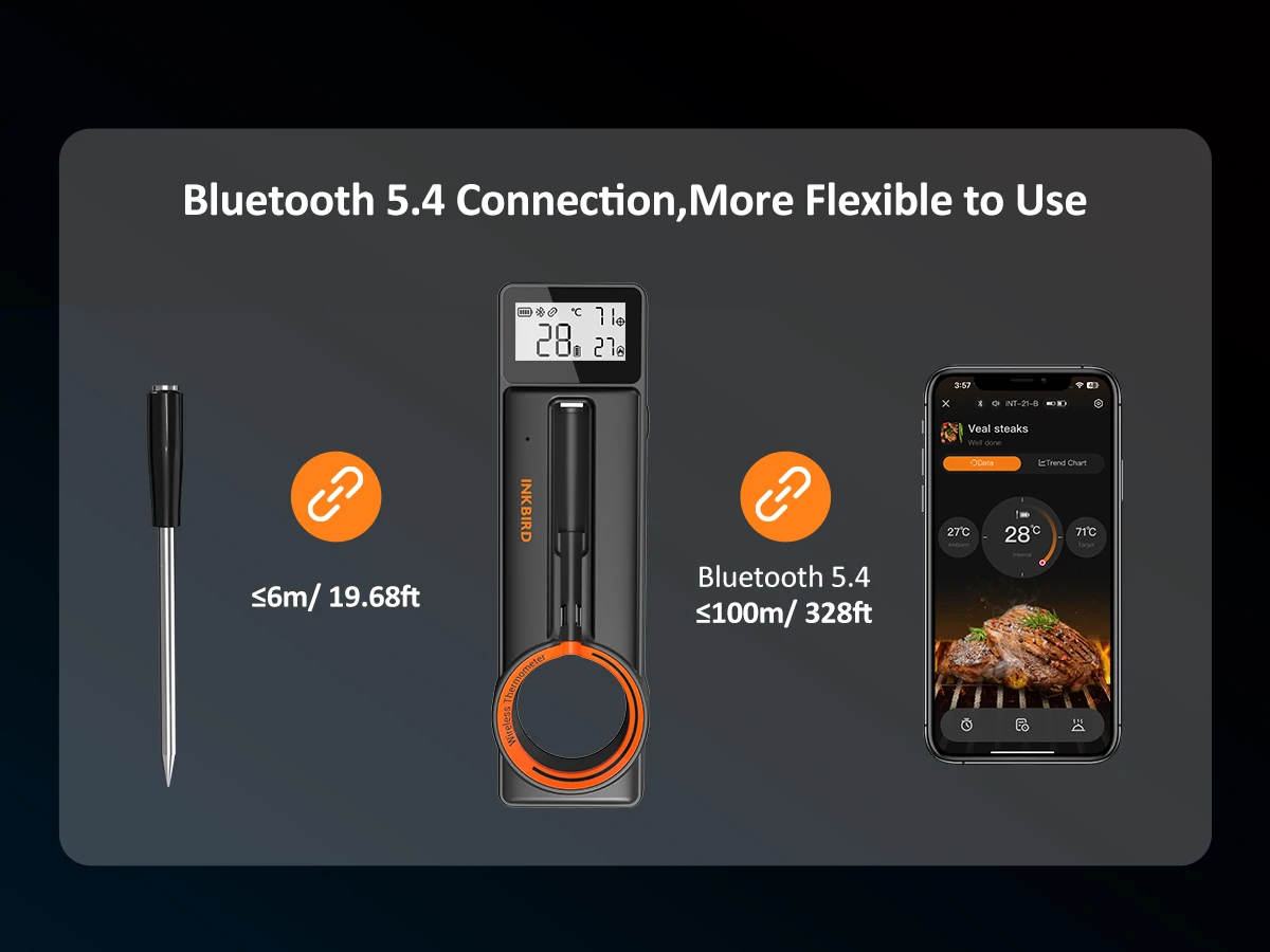 The INKBIRD INT-21-B is a smart, wireless needle meat thermometer that supports a stable and efficient wireless connection through Bluetooth 5.4, eliminating the need for users to worry about signal problems during cooking. It is equipped with a clear LCD screen, which displays food internal temperature and ambient temperature in real time, providing a clear overview of the cooking process. Additionally, the smartphone app allows for remote control and monitoring of the cooking process, enhancing efficiency and convenience. This wireless needle meat thermometer is suitable for both everyday home cooking and professional cooking exhibitions, making it a must-have for creating perfect meals.
