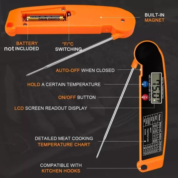 CONVENIENT & EASE TO USE. Kitchen Thermometer with foldable probe design folds away easily and locks into base for portability; Magnetic back and hook allows for convenient storage & auto shut off after 10 min, Thermometer case is made of strong ABS plastic