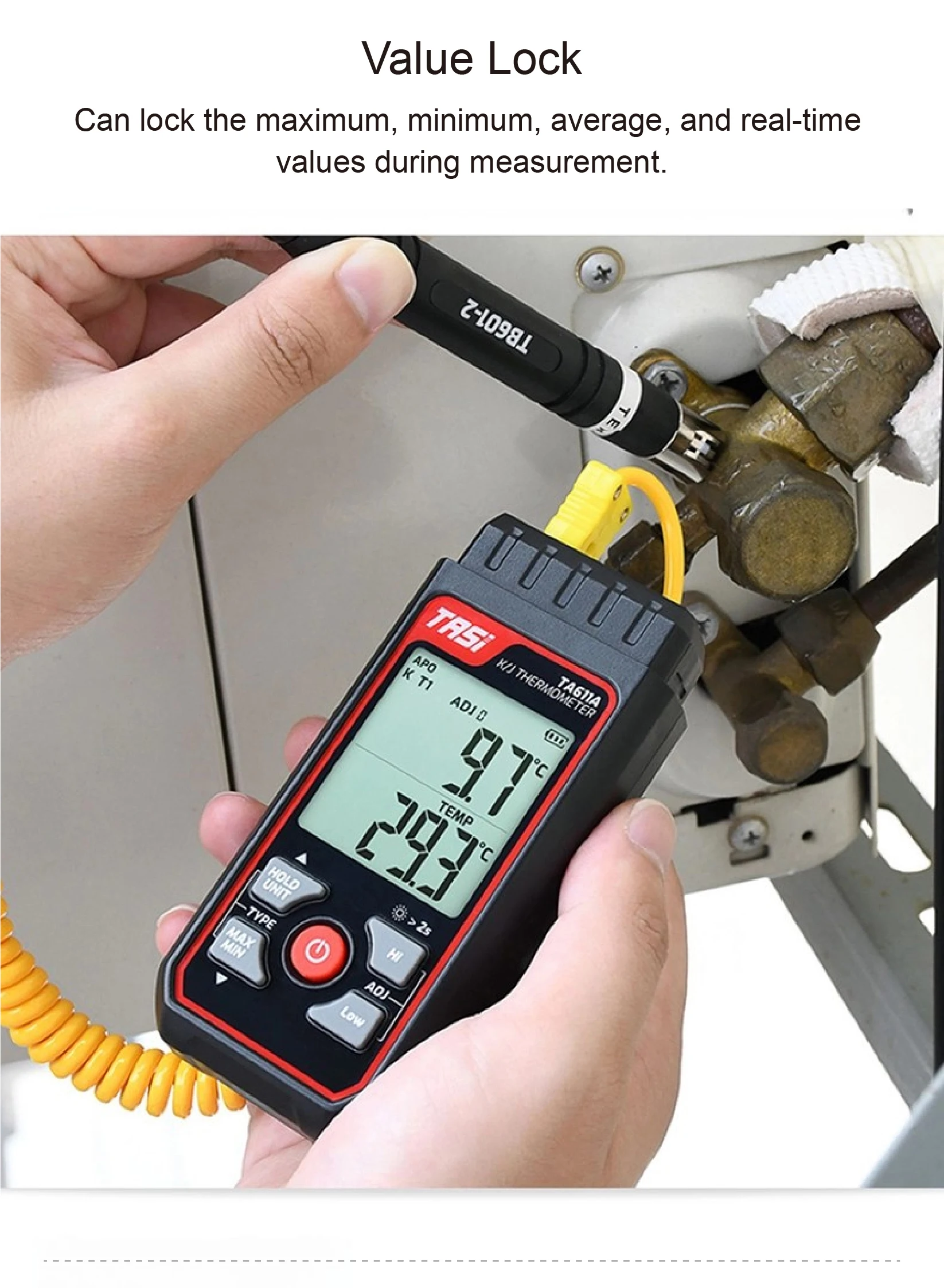 Locks maximum, minimum, average, and real-time readings for better analysis.