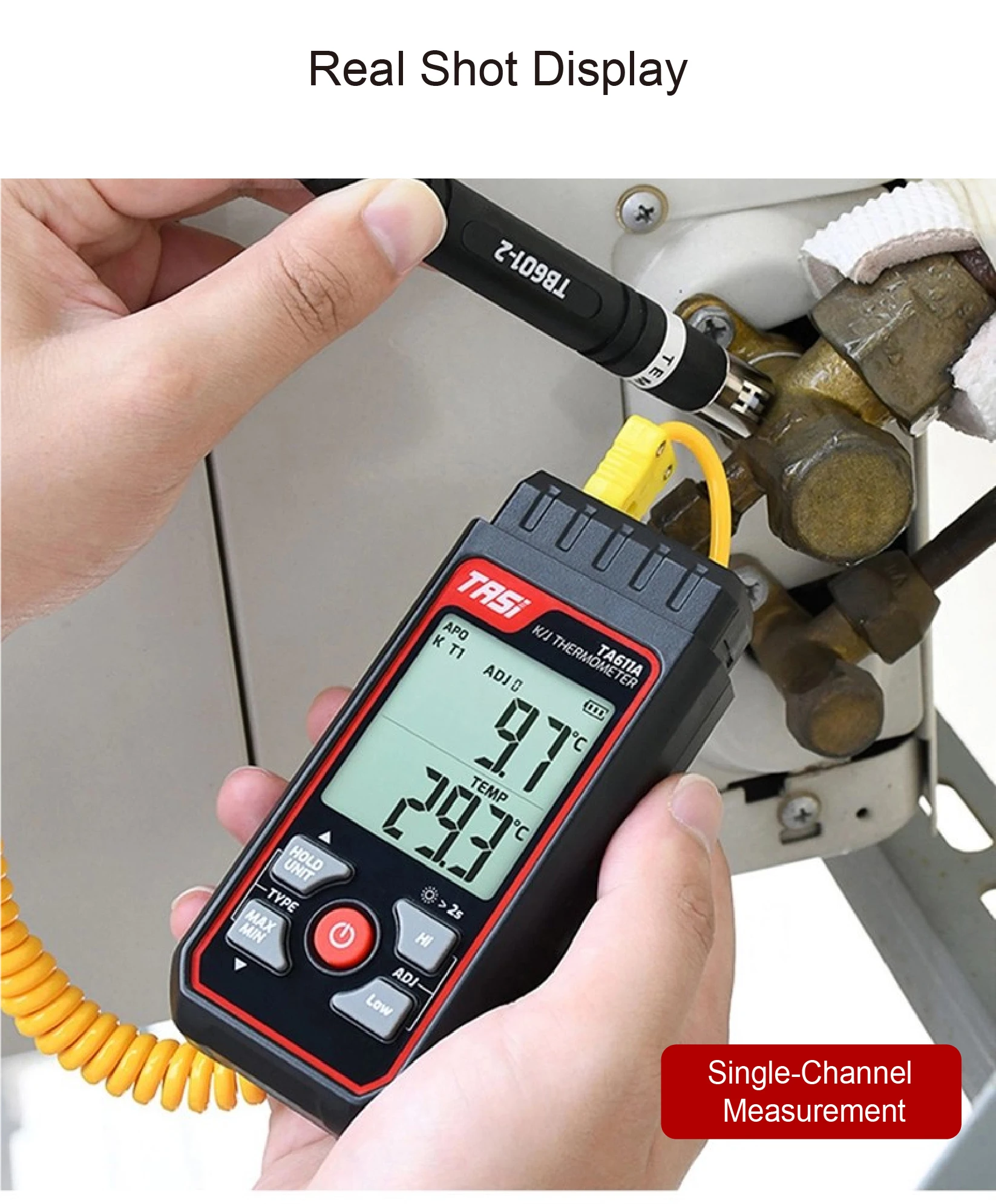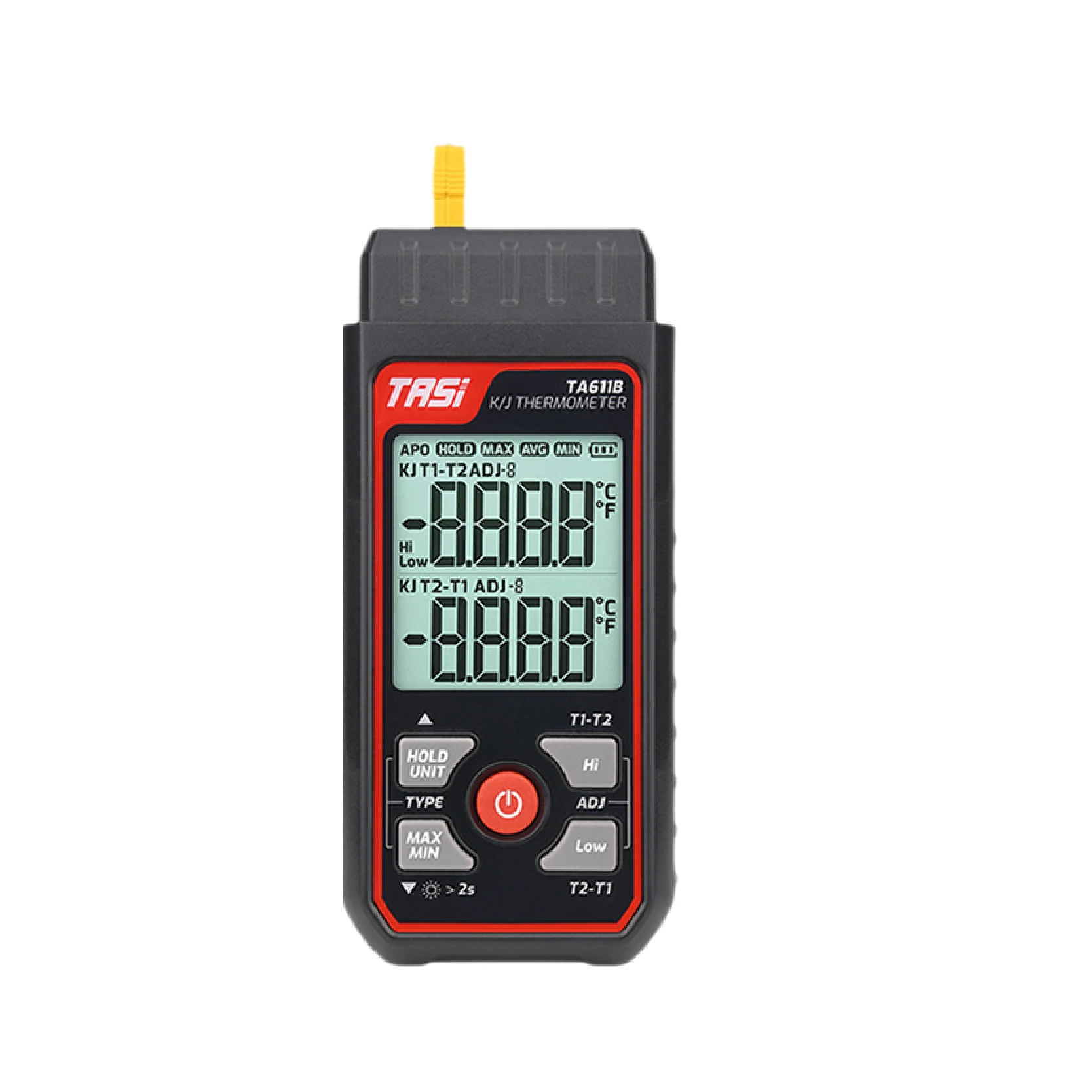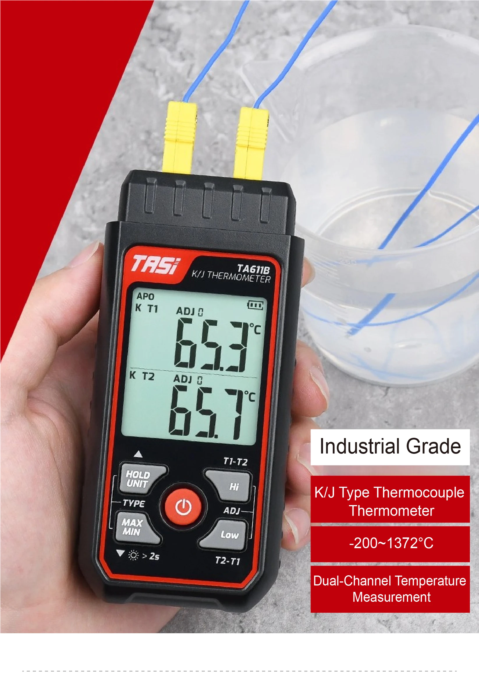 Measures from -200°C to 1372°C (-328°F to 2501°F) for both K/J-type thermocouples.