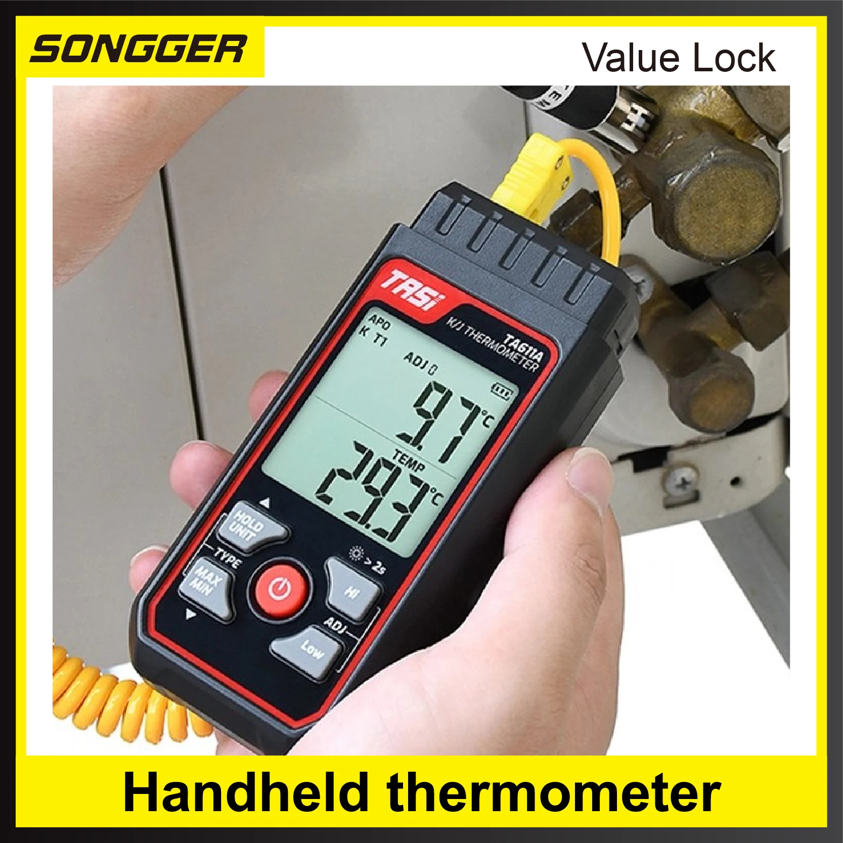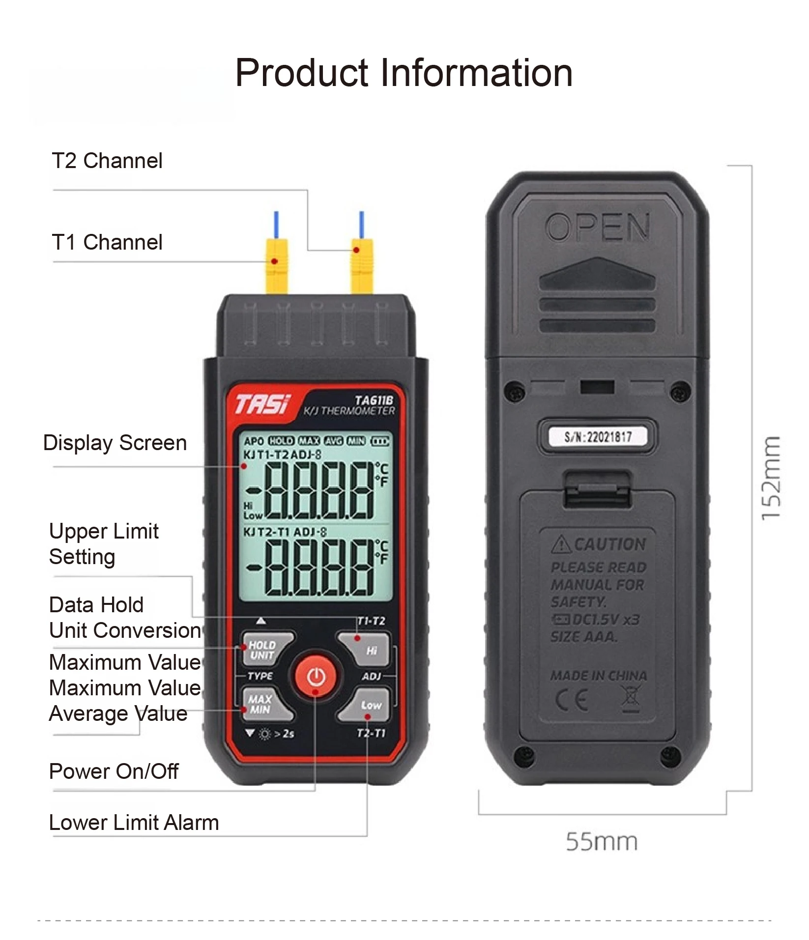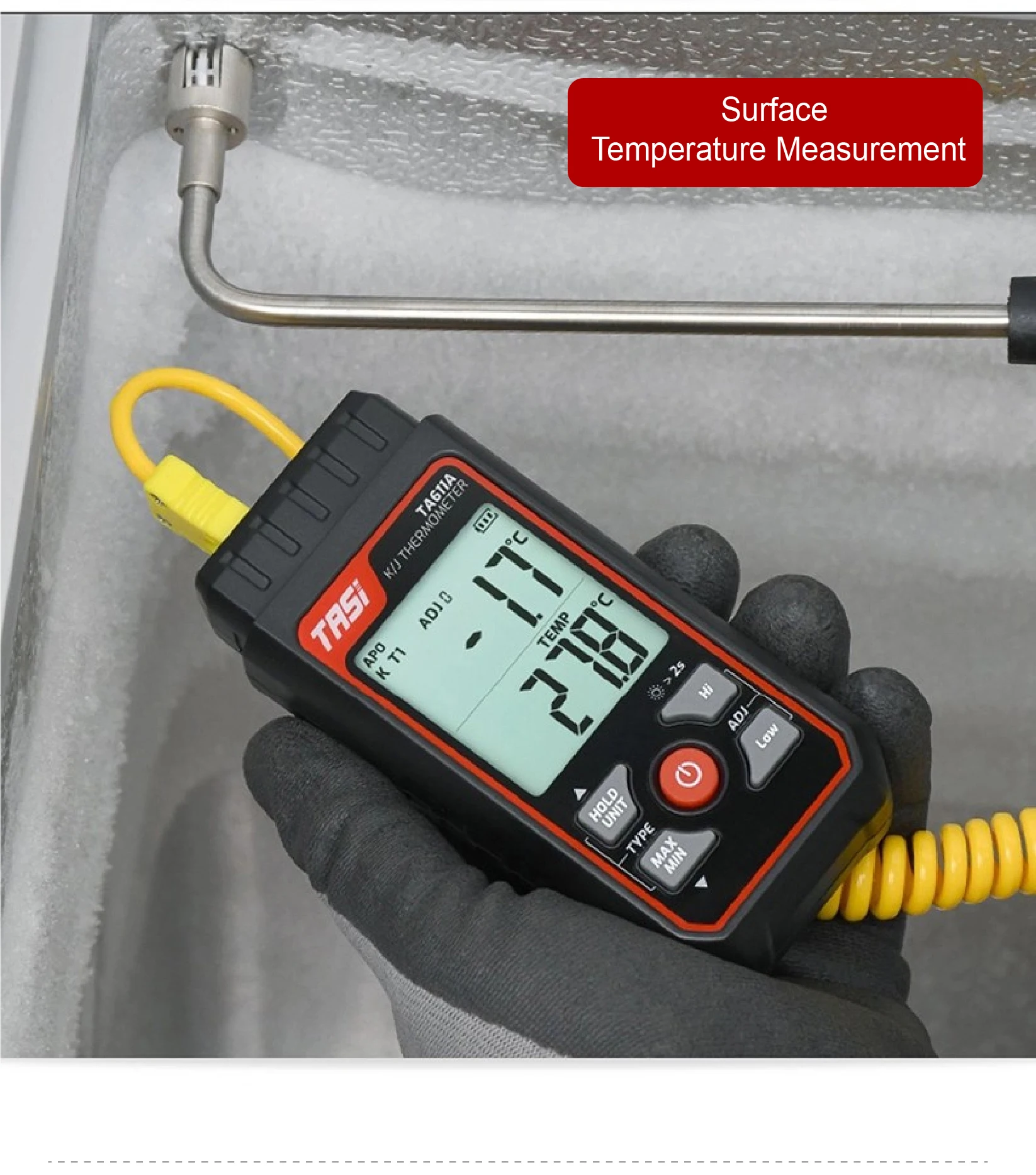 Measures from -200°C to 1372°C (-328°F to 2501°F) for both K/J-type thermocouples.
