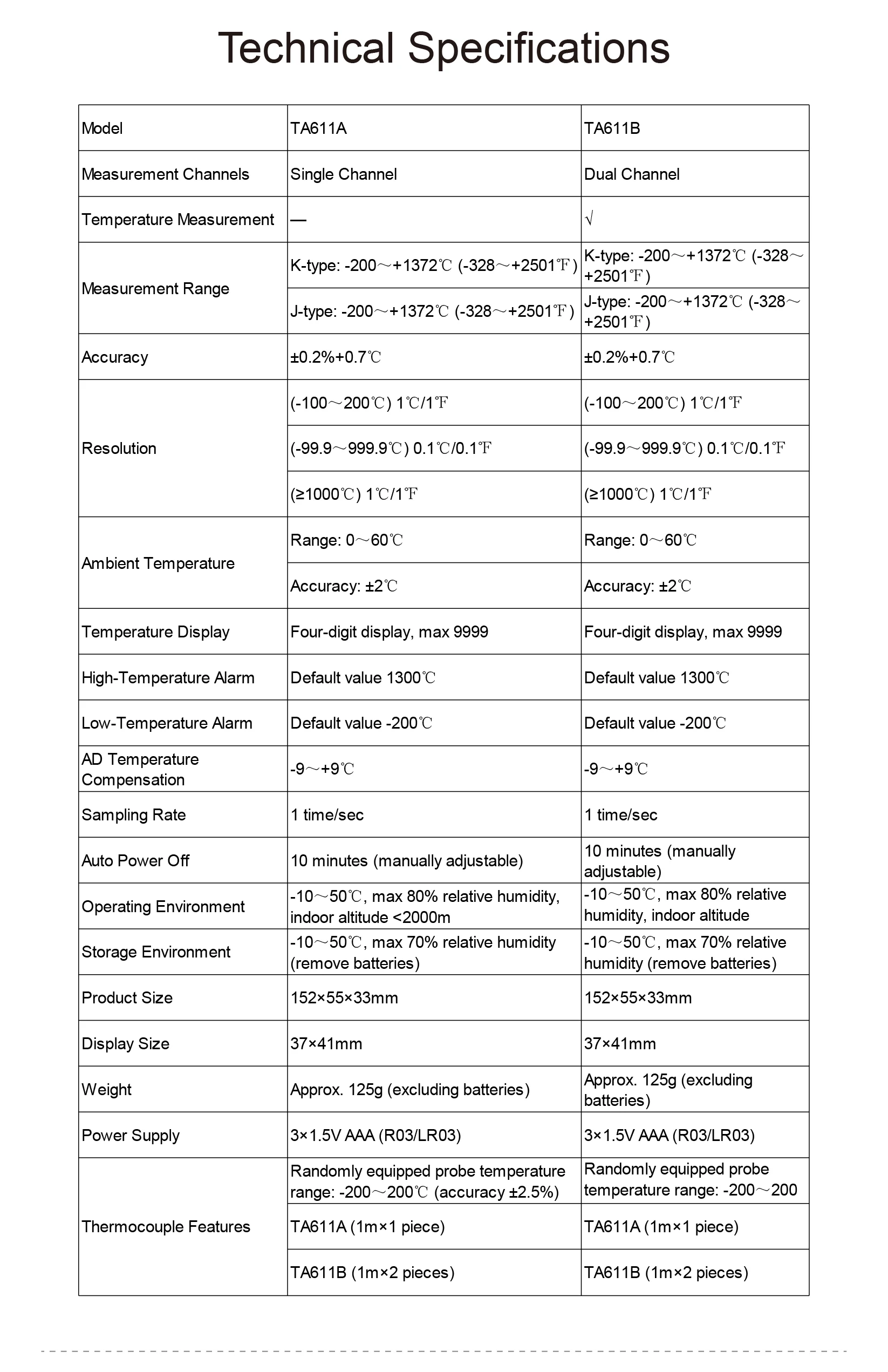A1: TA611A is designed for single-channel measurements, while TA611B supports dual-channel measurement for monitoring two locations simultaneously.