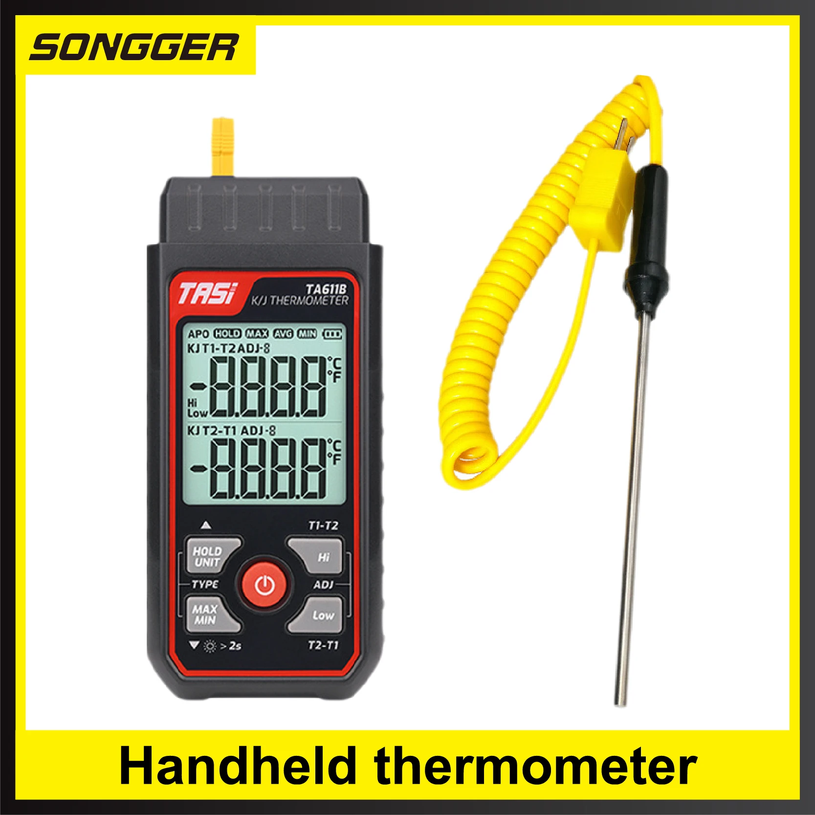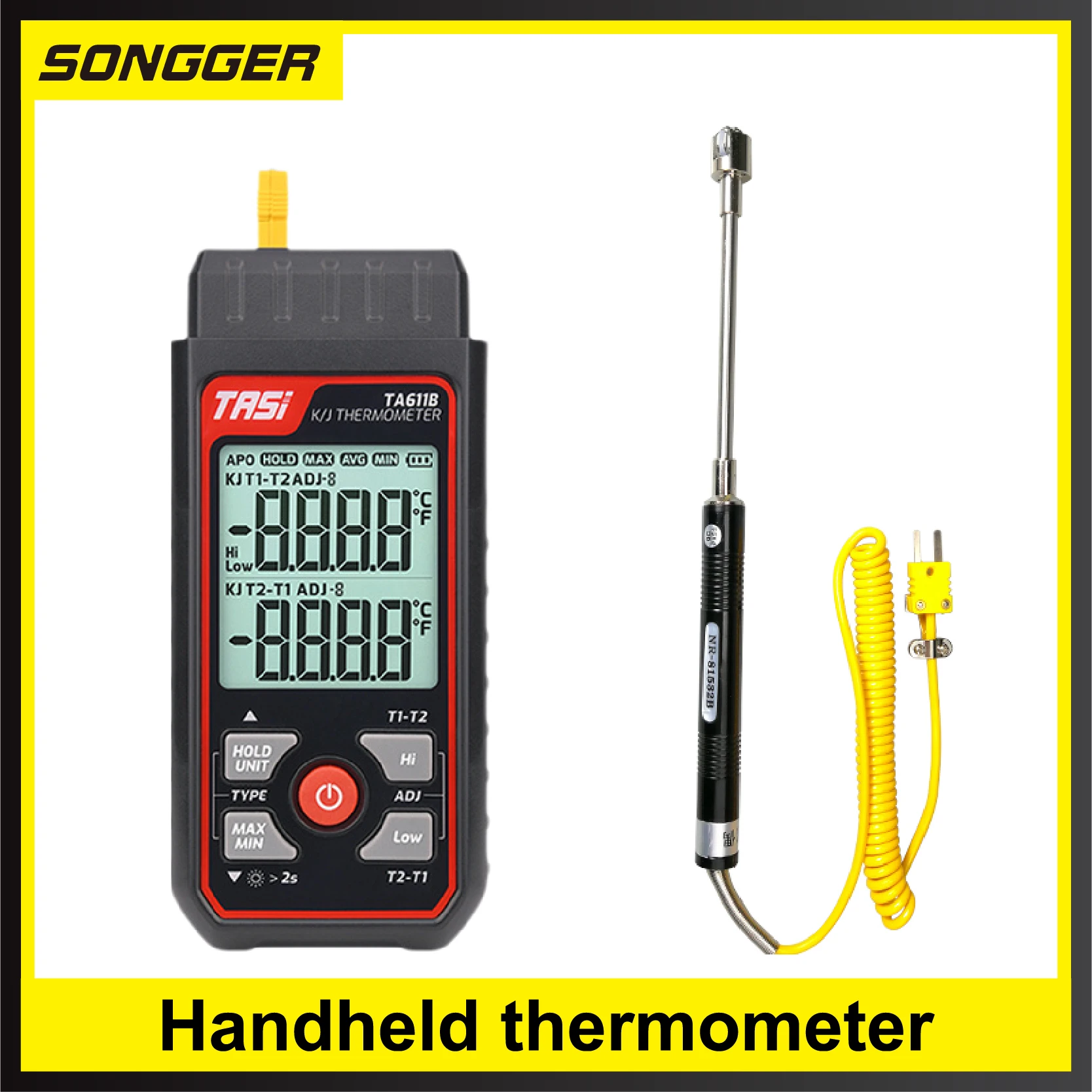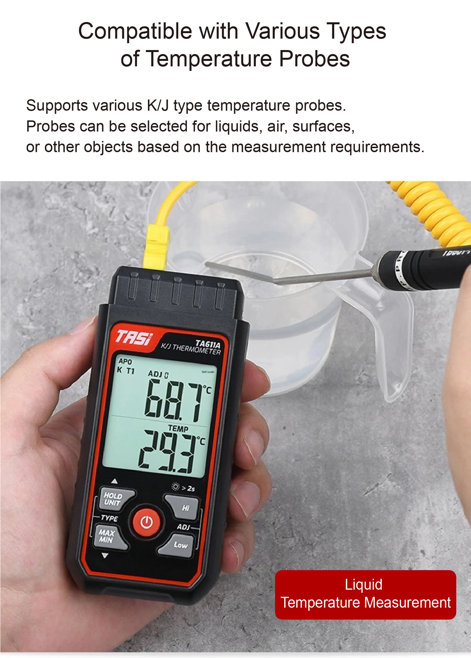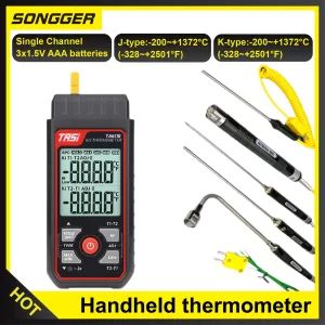 Works with various K/J-type thermocouple probes, including options for liquid, air, and surface temperature measurements.