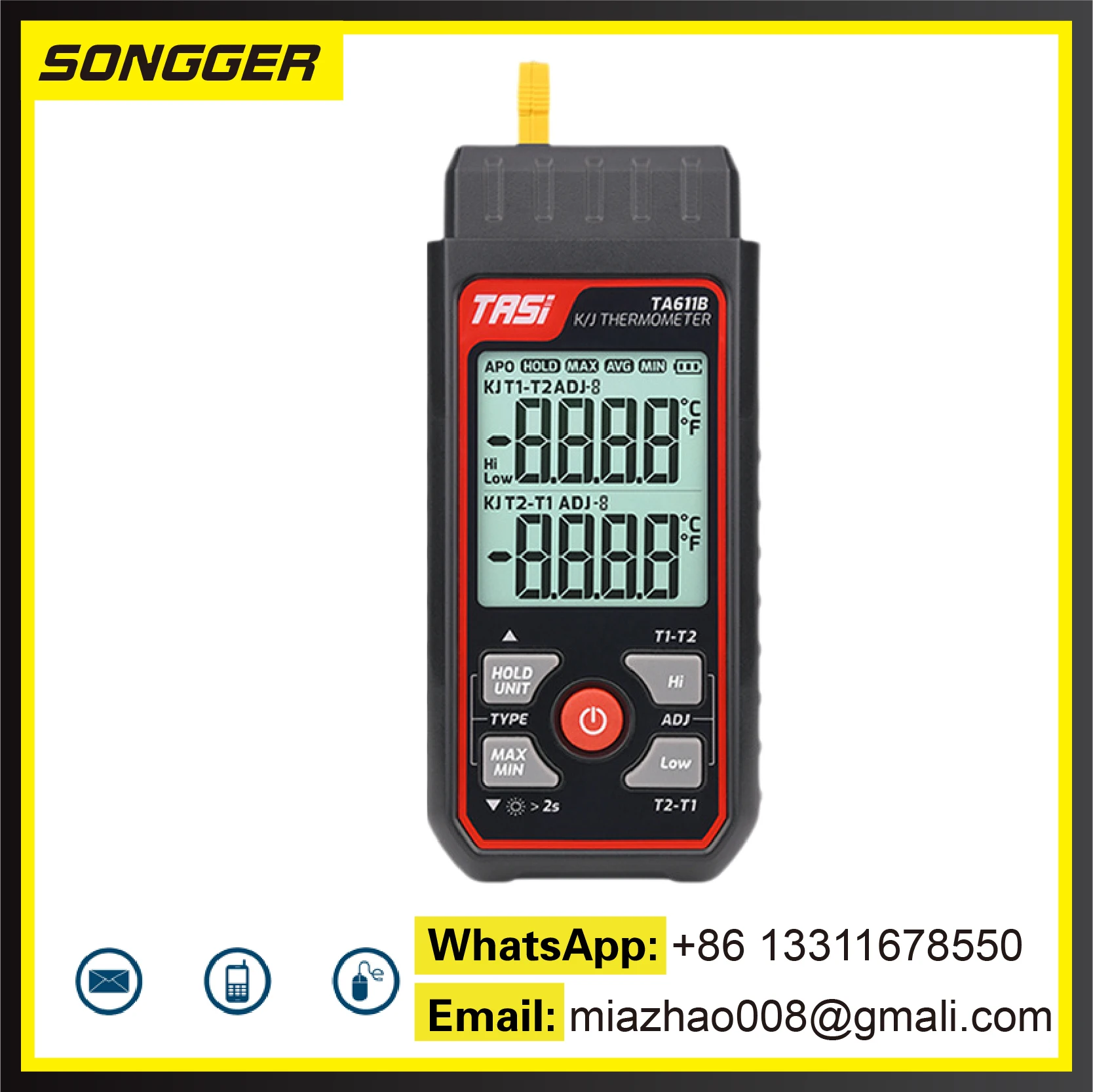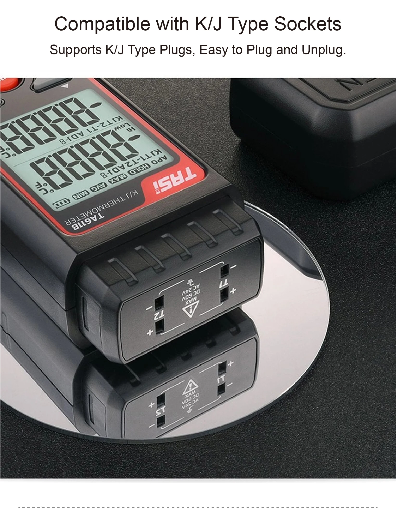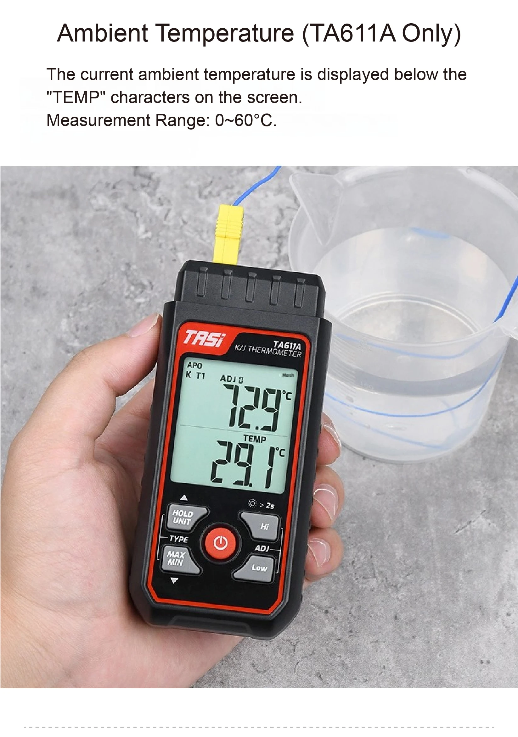 Works with various K/J-type thermocouple probes, including options for liquid, air, and surface temperature measurements.