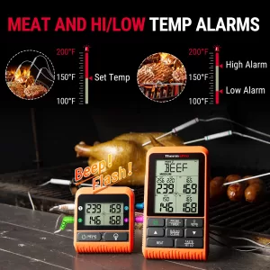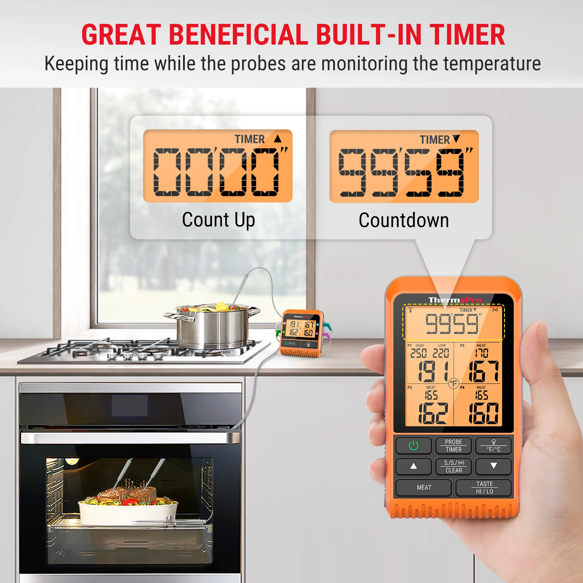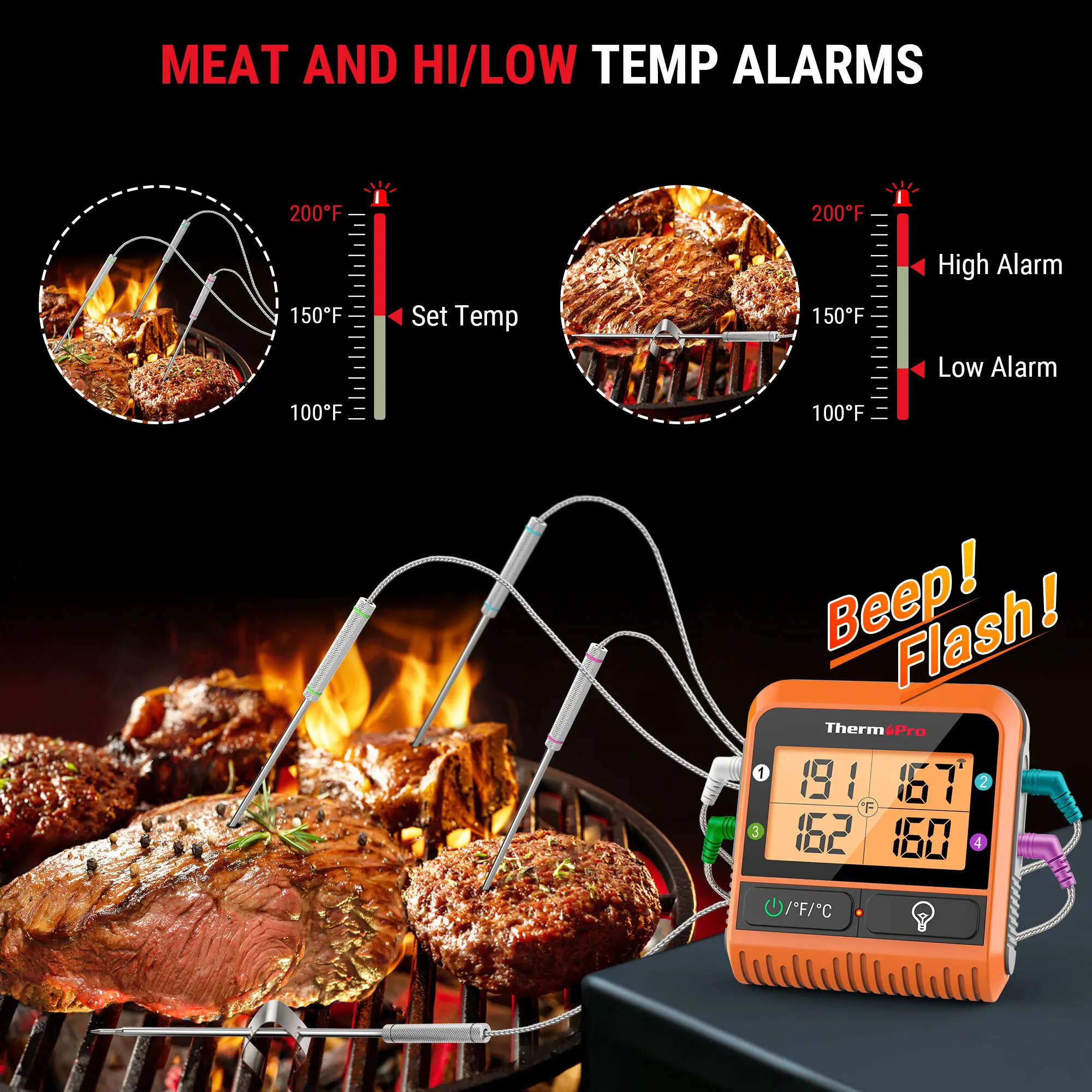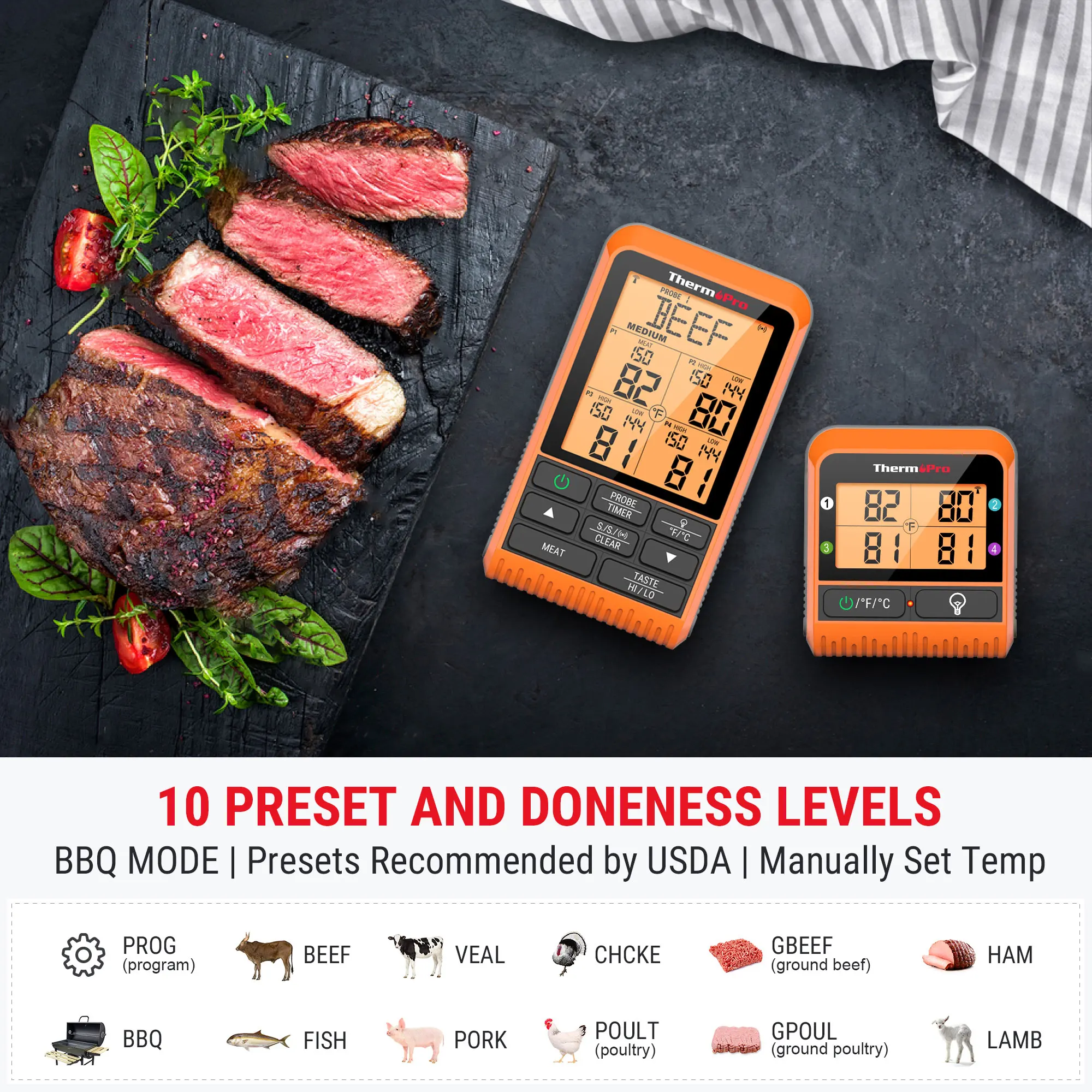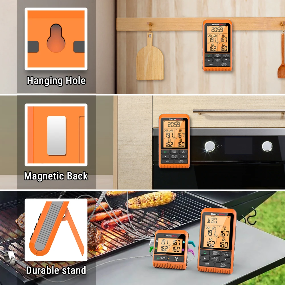 TP829C equip with 4 coated meat probes, and 4 temperature of food or oven/grill, smoker can be monitored at the same time.