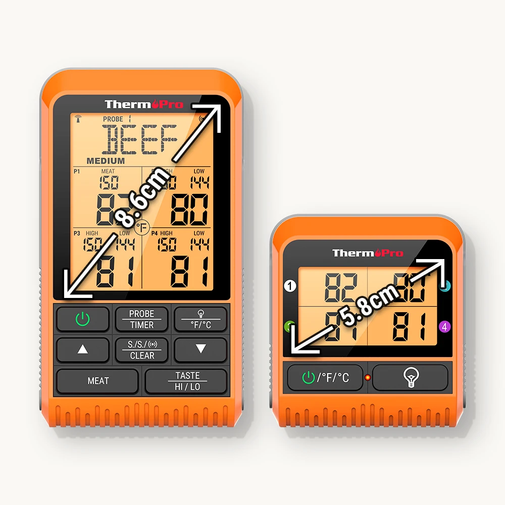The size of TP829C receiver screen is 8.6CM , which 4 temperatures and timer can be displayed at the same time on this big screen.