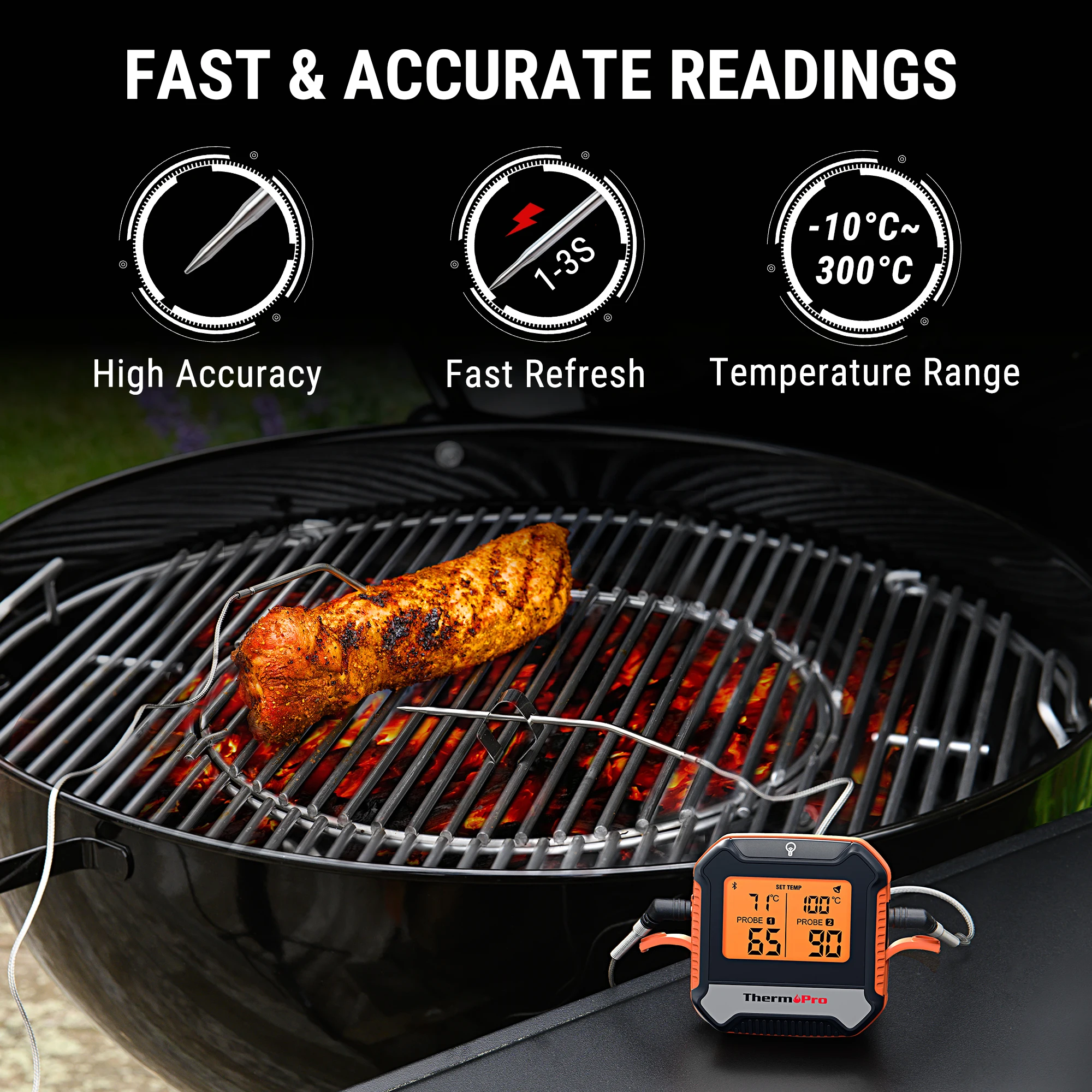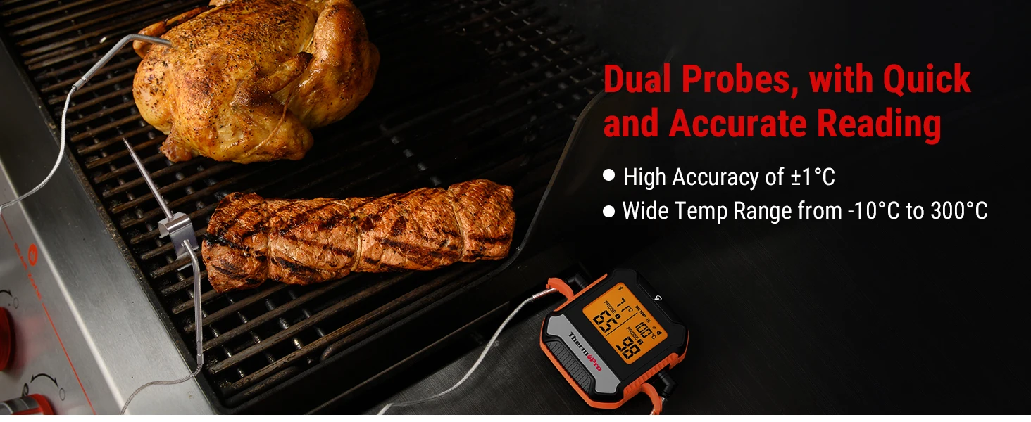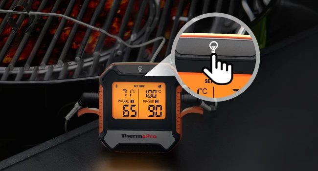 The wireless thermometer comes with 2 probes. The thermometer’s backlit LCD displays 2 separate readouts with the preset and current temperature for each probe.