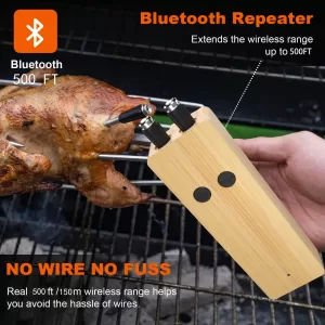 SMART MEAT THERMOMETER: This 100% truly wireless meat thermometer comes with a built-in Bluetooth repeater that extends the range. You can store and charge your probe, and it offers over 36-48 hours of continuous cooking per charge. It is great for electric barbecues, smokers, ovens, grills, frying pans, or sous vide cooking. Â