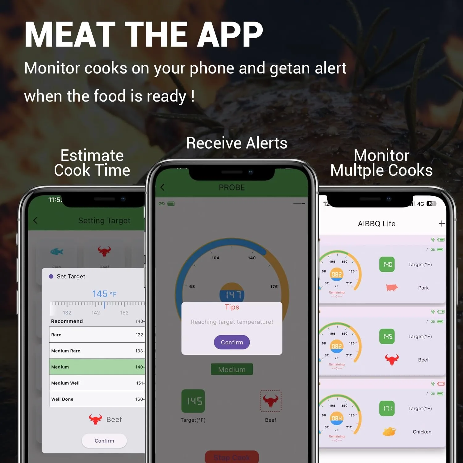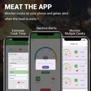 1. Real-Time Monitoring: Get precise temperature readings directly on your smartphone with our smart wireless meat thermometer. The app is compatible with both iOS and Android devices, ensuring seamless monitoring at your fingertips.
