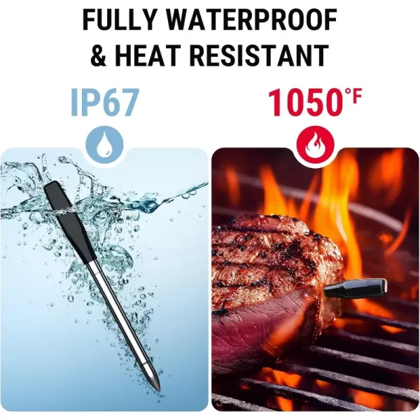 【Tougher Durability】Our wireless meat probe is safe against heat and water. 1050°F Heat resistant ceramic handles make this cooking thermometer ideal for high-heat cooking like frying and searing; IP67-rated waterproof design is safe for dishwasher cleaning. Built with top-quality materials and craftsmanship, this kitchen thermometer is built to last
