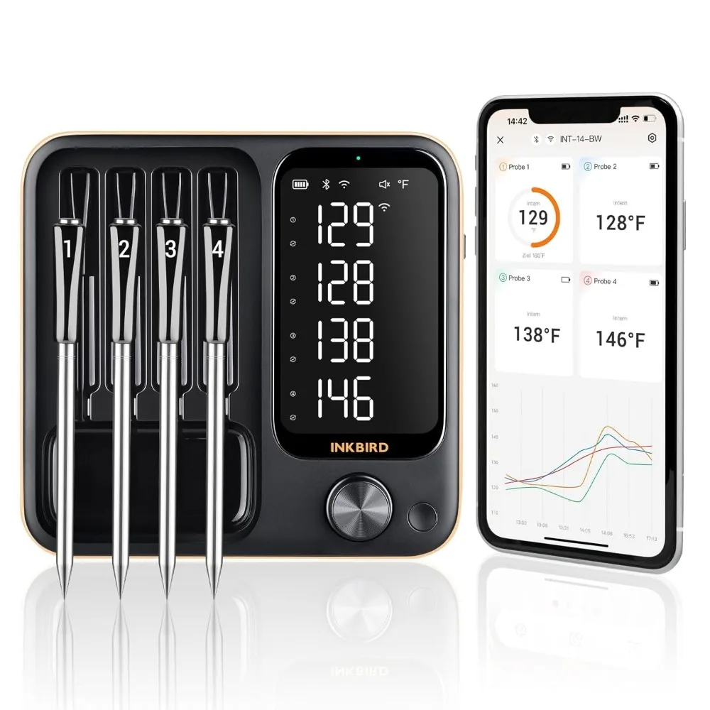 First Ever Three-Mode Operation: The INT-14-BW is the first BBQ thermometer to feature 2.4GHz WiFi, Bluetooth 5.4, and local offline operation. In WiFi mode, you can remotely control and monitor the cooking process on your smartphone from the office. In Bluetooth mode, you can relax in the living room while the grilling is in progress and receive a notification on your smartphone when the grilling is complete. And in local mode, you can fully indulge in the barbecue party with your family and friends! WiFi/Bluetooth/Local, three modes to use for smart and convenient cooking anytime, anywhere