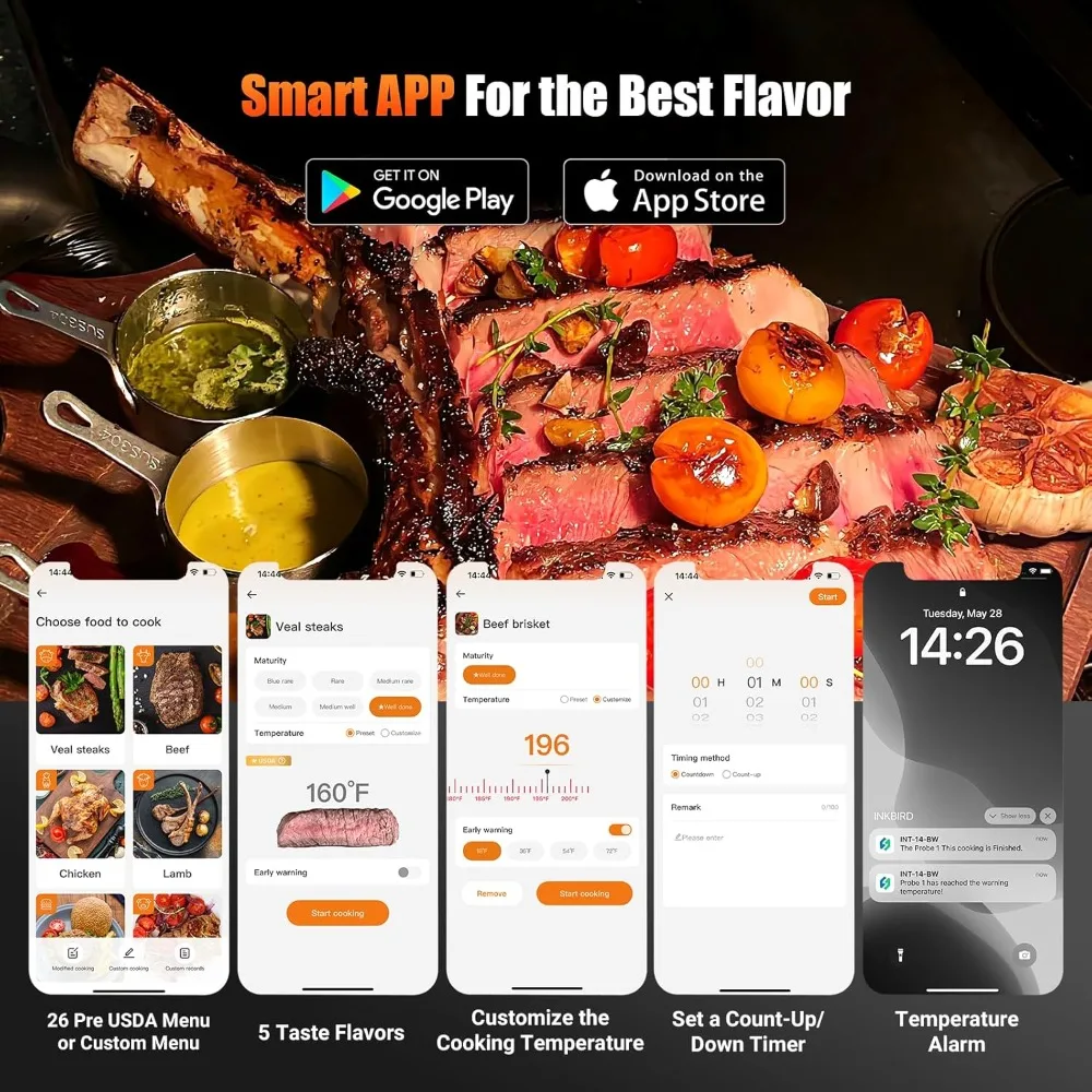 Smart Cooking + 30min Offline Data Storage: The app includes 26 meat menus with USDA-recommended meat cooking temperatures to let you create a cooking program with ease. You can also customize the cooking temperature and set a count-up/down timer, and with the use of temperature alarms, you can easily create five-star delicacies. Plus, the temperature pre-alarm function give you enough time to prepare before the cooking is complete so that you can enjoy the food at its best taste condition. In addition, the device itself can store 30 minutes of offline temperature data and sync with the app via wireless connection, so you can see all temperature data in the history graph