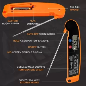 ♥ CONVENIENT & EASE TO USE. Kitchen Thermometer with foldable probe design folds away easily and locks into base for portability; Magnetic back and hook allows for convenient storage & auto shut off after 10 min, Thermometer case is made of strong ABS plastic