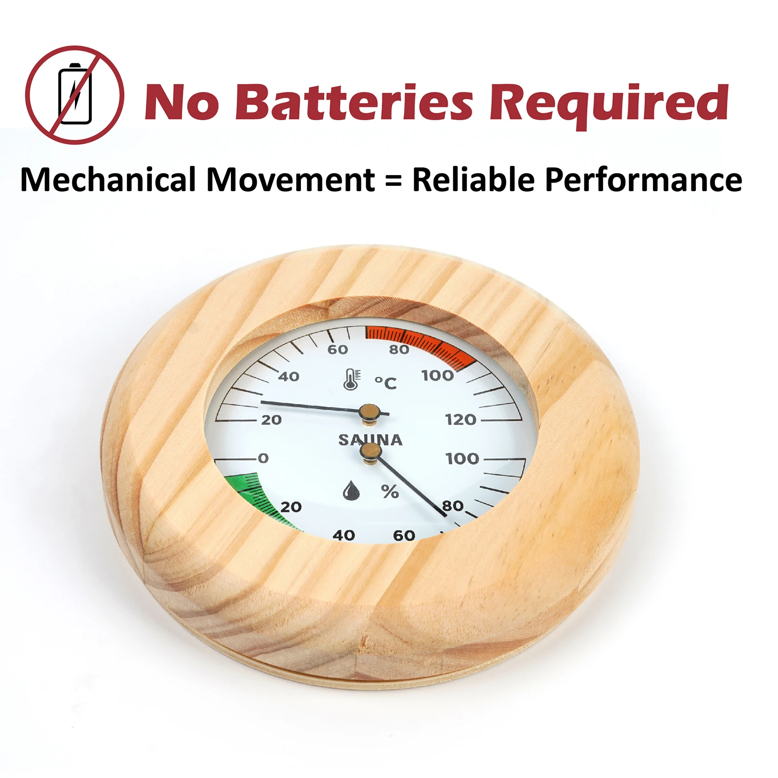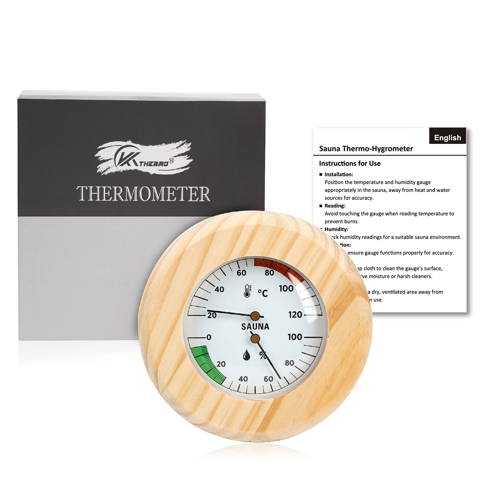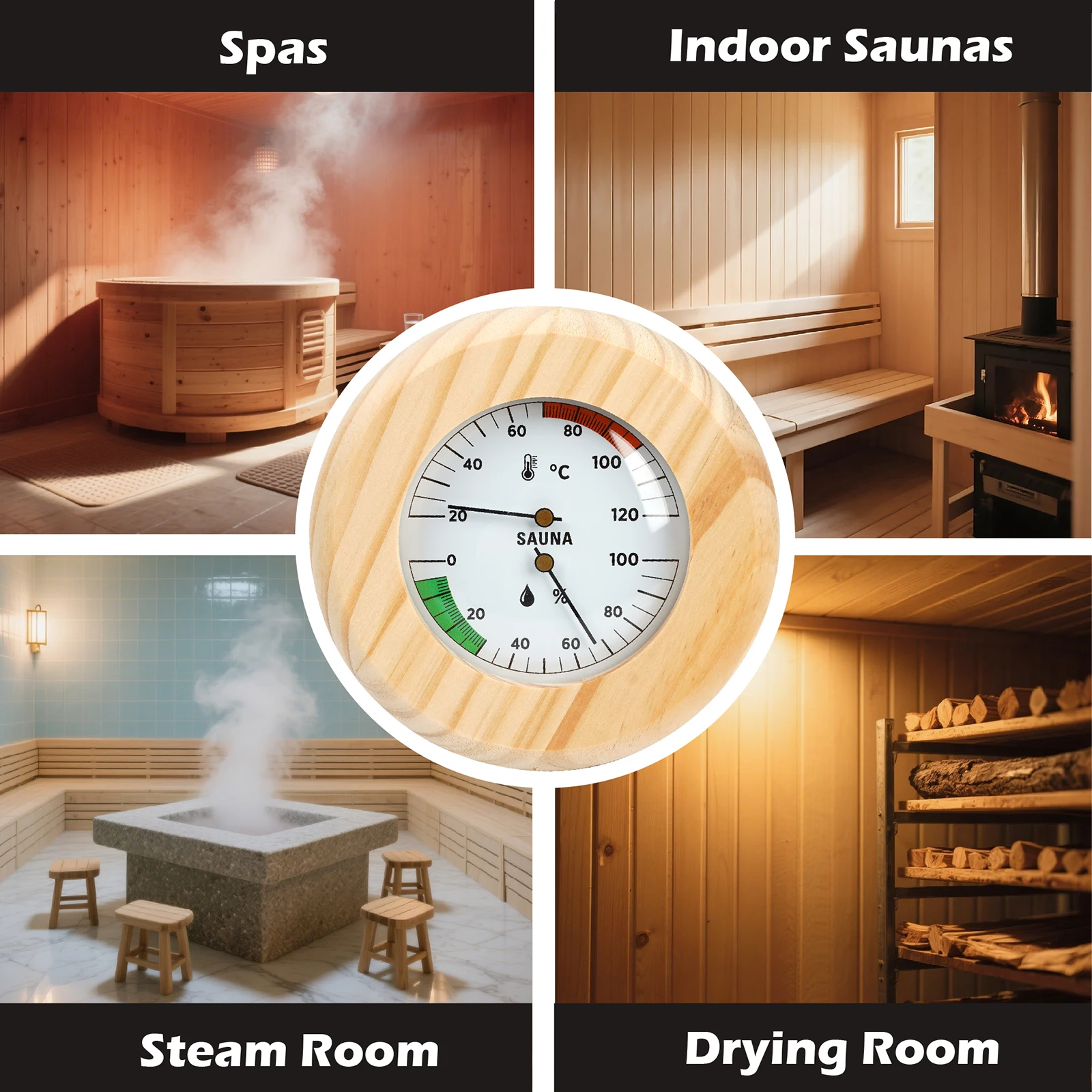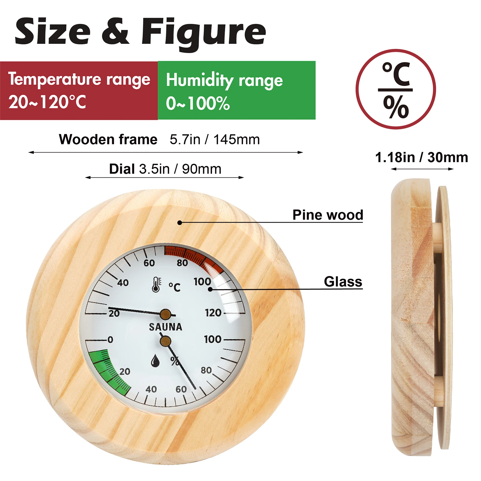 Crafted with a solid wood frame and durable glass cover, this round sauna thermometer and hygrometer is a perfect fit for both home and commercial sauna settings. It features a split display for temperature and humidity, offering clear, real-time environmental data.