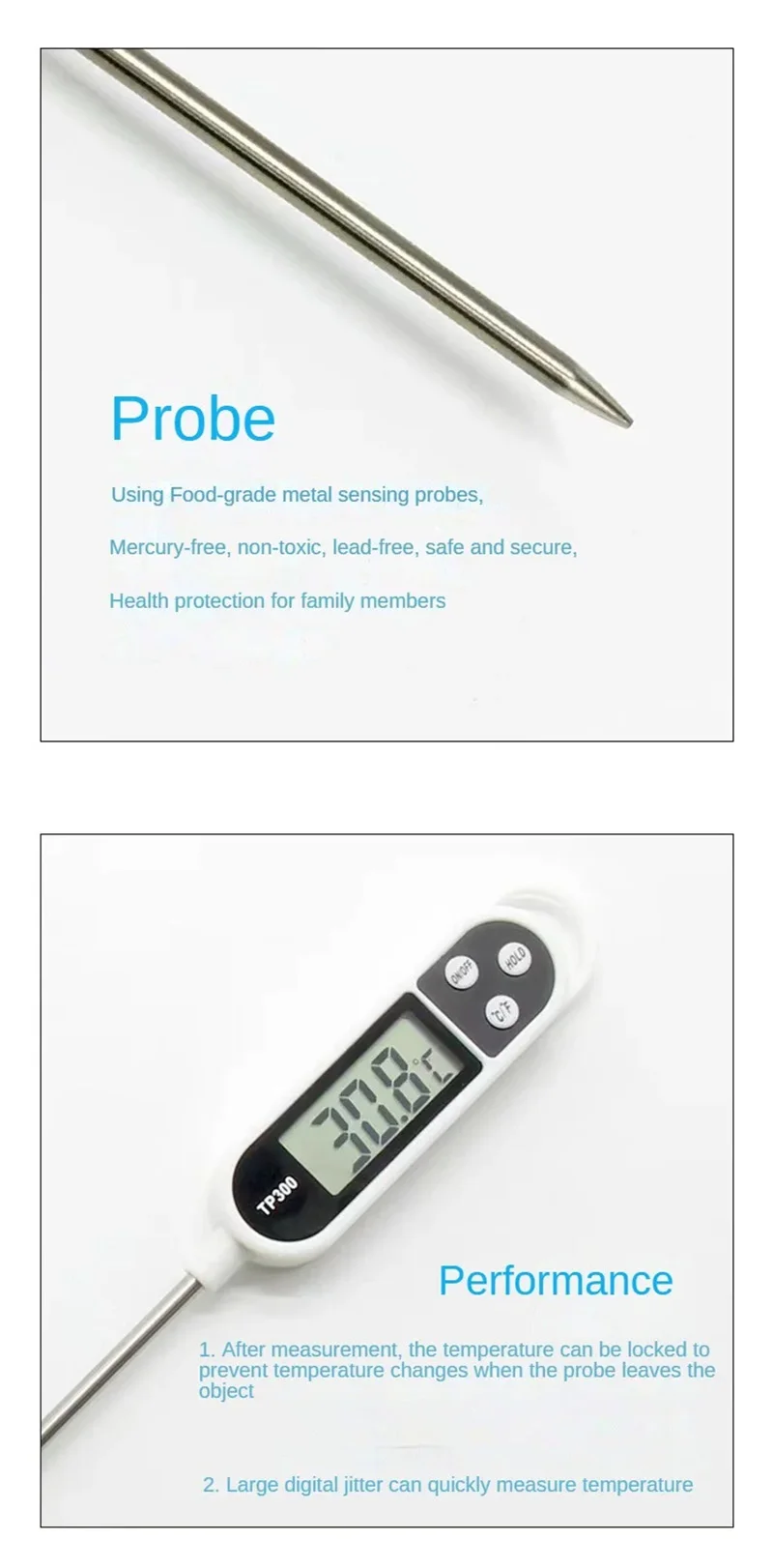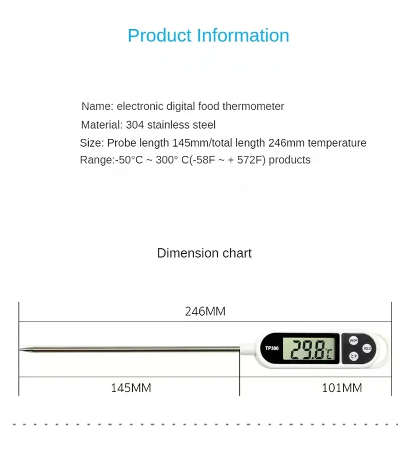 5. Measuring Temperature Range:Â The kitchen thermometer has a temperature measuring range of -50 degrees to 300 degrees, so it is ideal for most temperature measurements in grilling, food preparation, food processing, refrigeration, laboratory, catering and other scenarios.