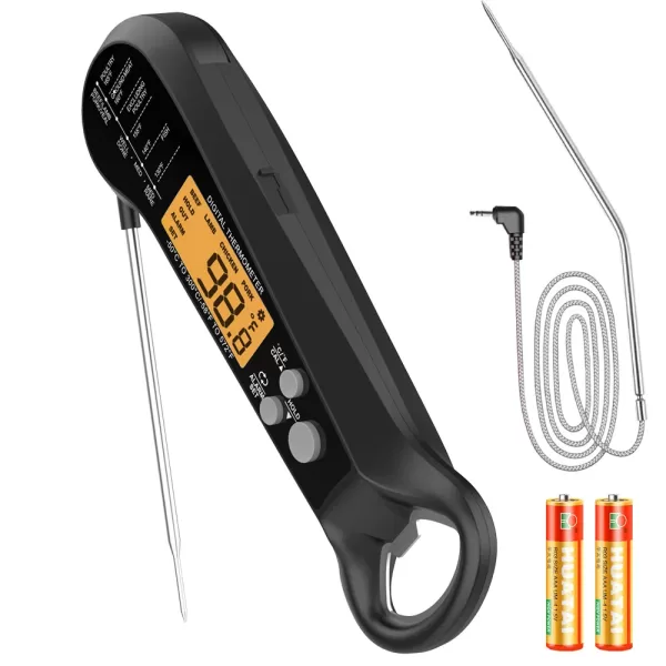 • Dual Probe Design for Versatile Cooking: Geyrut cooking thermometer equipped with two probes – a wire probe for oven use and a rotation probe for meat, ensuring precise temperature monitoring for various cooking methods.