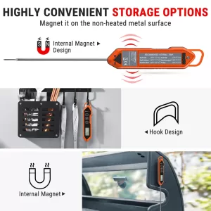 TP15H is built-in Magnet, and allows you to attach the Grill thermometer onto your refrigerator door, barbecue rack or any other metal surface; You can hang your waterproof thermometer on a hang hole as well!