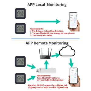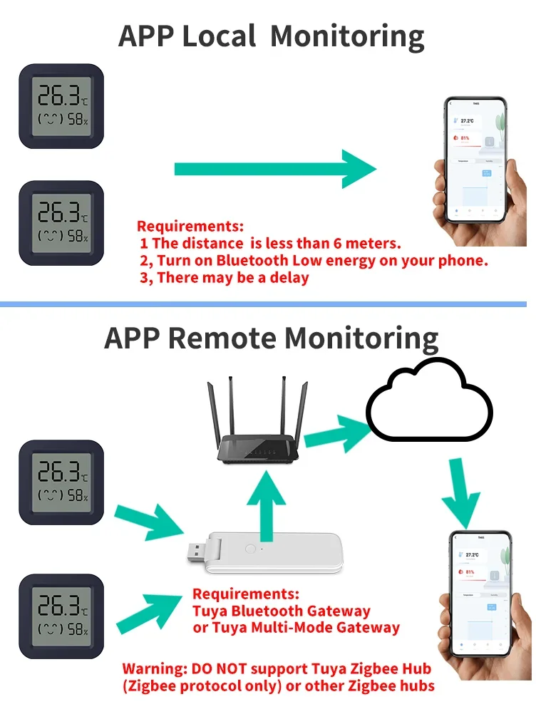 If you want to remotely monitor temperature and humidity, you must configure the sensor to Tuya Bluetooth Gateway or Tuya Multi-Mode gateway.If the mobile phone Bluetooth configure is used, the sensor has no remote monitoring or linkage function.If the mobile phone is directly connected, some Android phones need to turn on the GPS function (low-power Bluetooth is included in the GPS function)