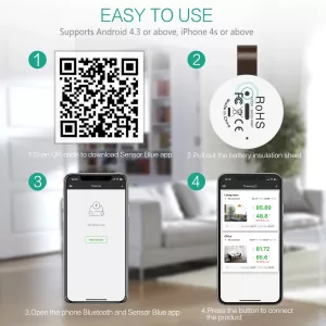 【Portable Design】Wireless sensors Smaller size than other brands(1.5 x 1.5 x 0.62 inches). Space-saving and portable. It can be used for about 1 year withCR2477 battery. 【Bluetooth distance range】This product supports a barrier-free distance of 50 meters between the mobile phone and the transmitter