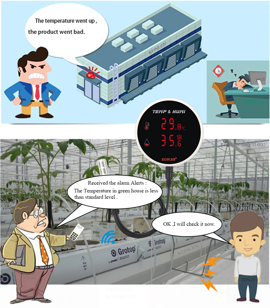 If the temperature ( Humidity ) is higher or lower than the range of temperature (humidity ) we preset . The detector will push the alarm alerts to app and at the same time the detector will make buzzer sound to remind to control the temperature ( humidity). And you can do the real-time supervision via app.