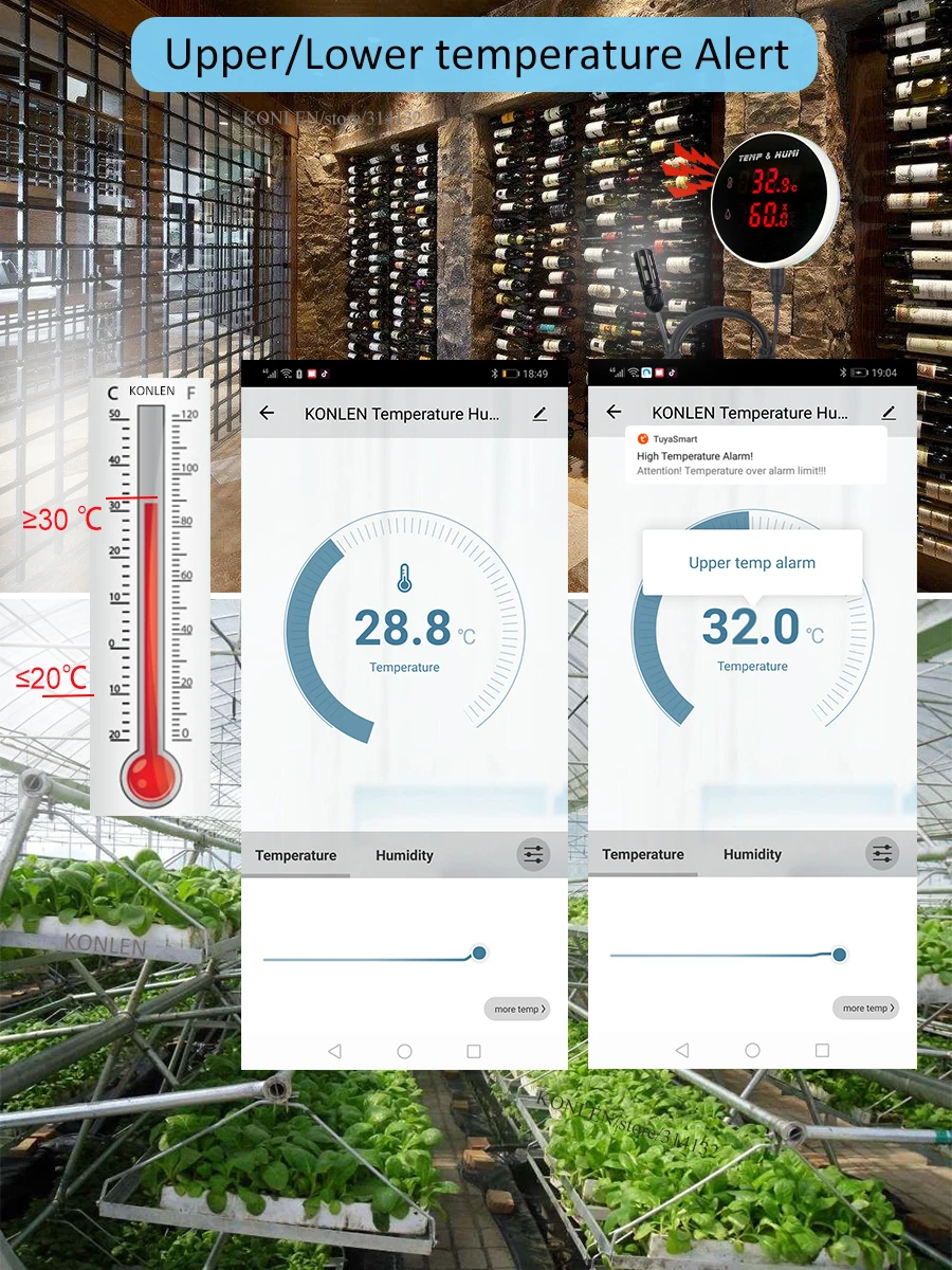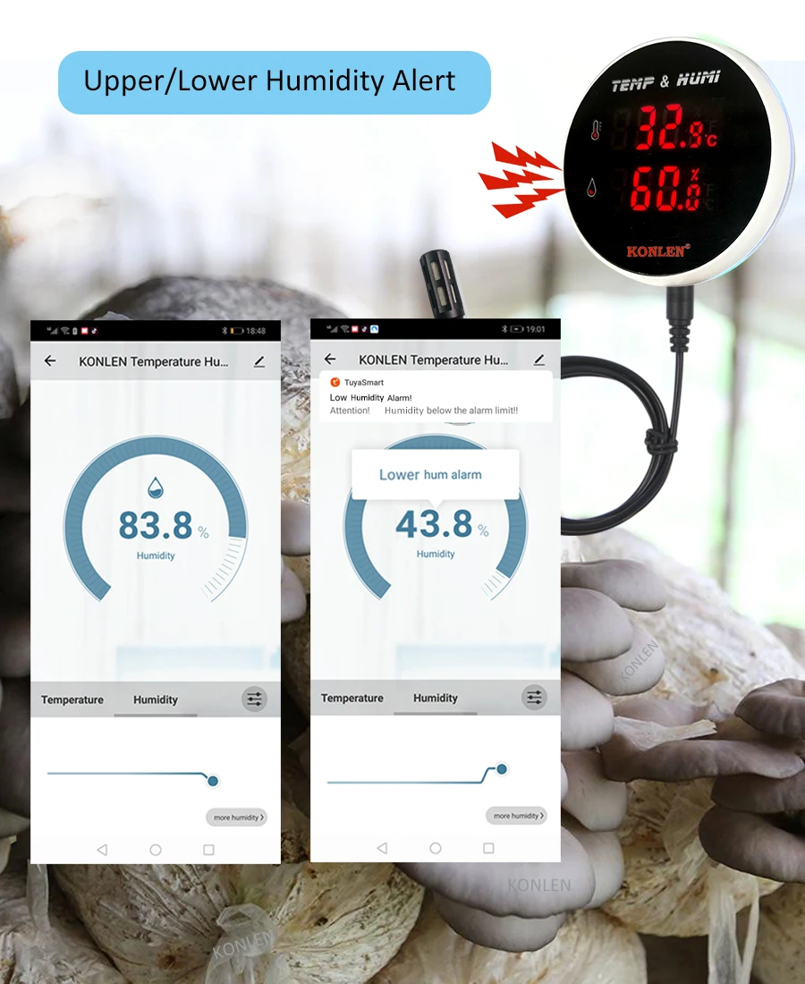 2. Higher/Lower temperature/humidity alarm, push notification and buzzer alert