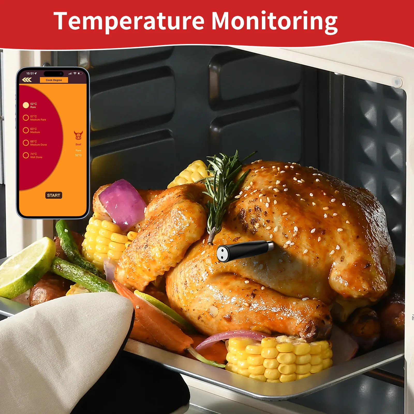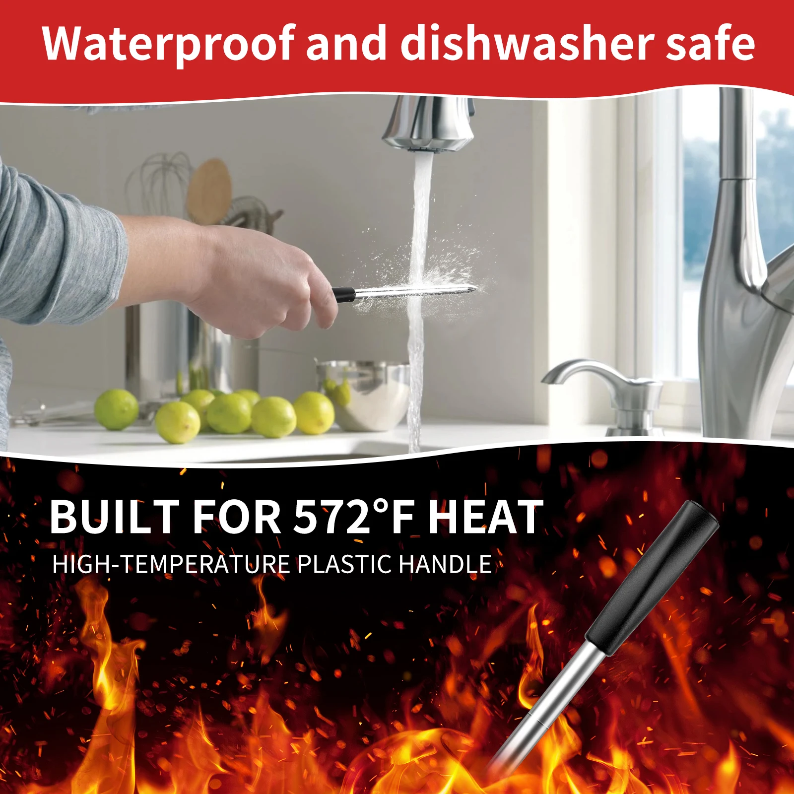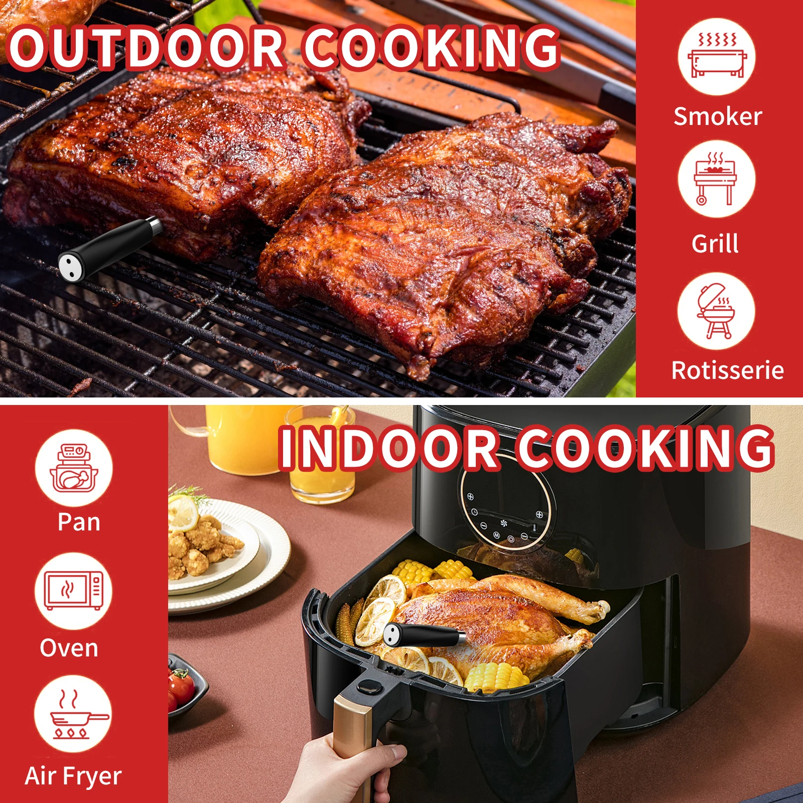🌡️ Dual-Sensor Precision – Two temperature sensors in one probe track both internal meat temp and external oven/grill heat simultaneously for perfectly cooked meals.