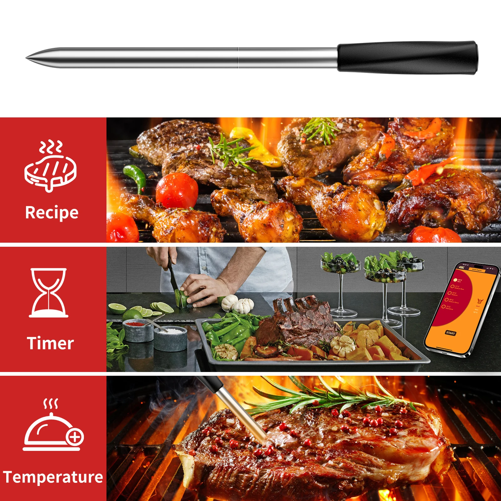 ⏱️ Smart Time & Doneness Estimator – The advanced algorithm predicts cooking and resting times, helping you plan meals like a pro.